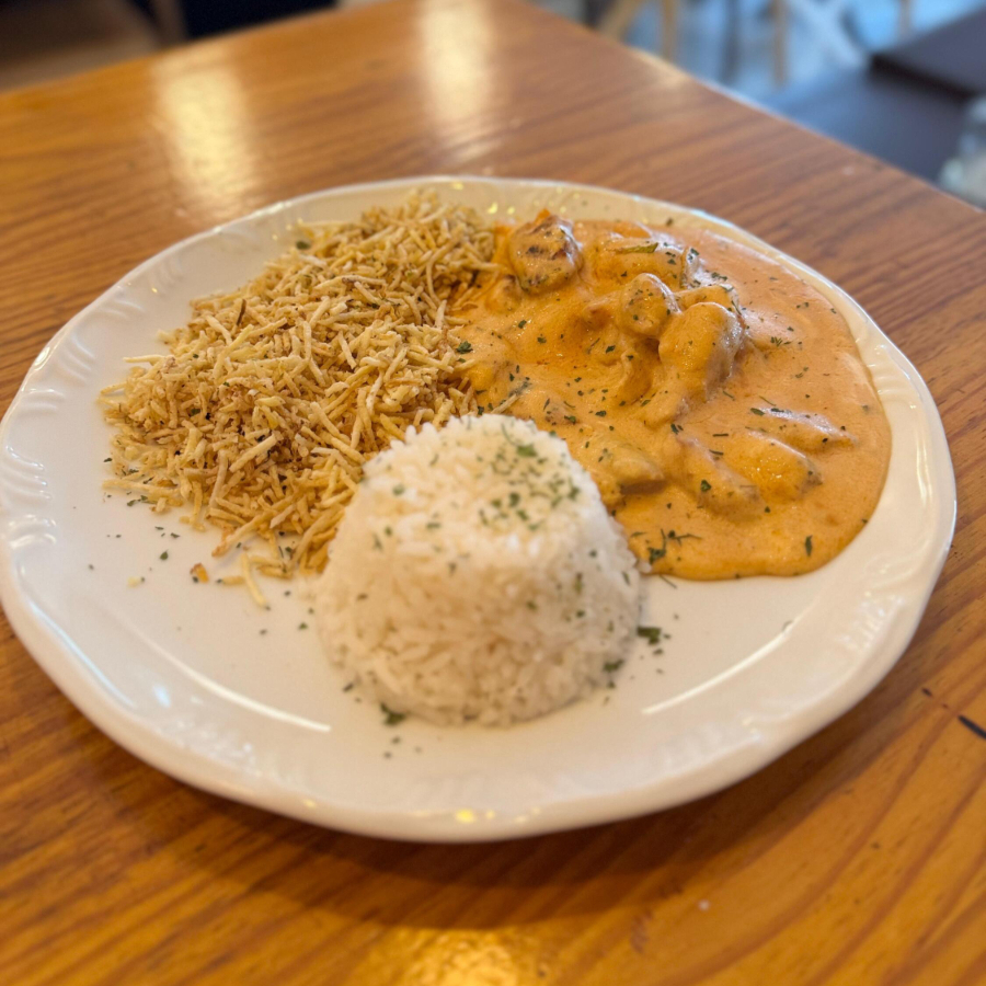 Acompanha: Arroz, Molho de Tomate, Batata Frita e Salada.