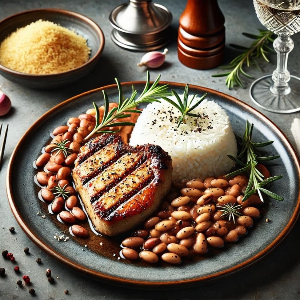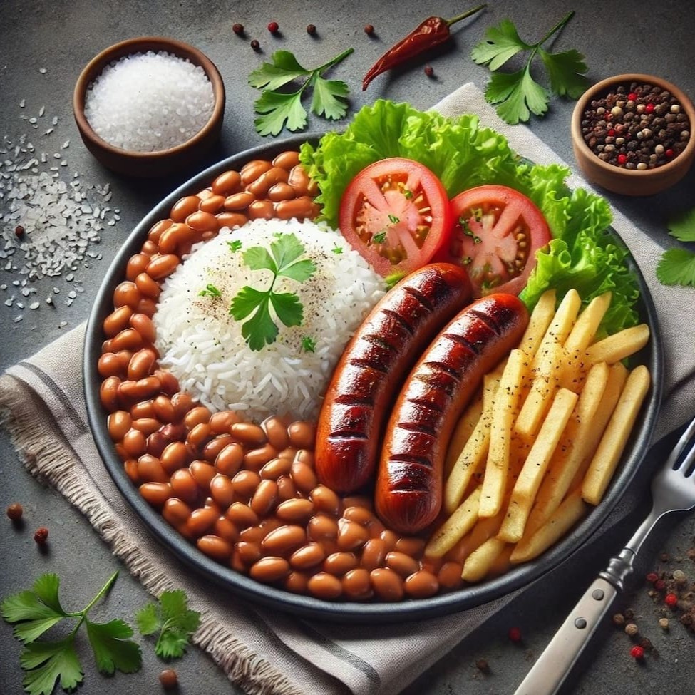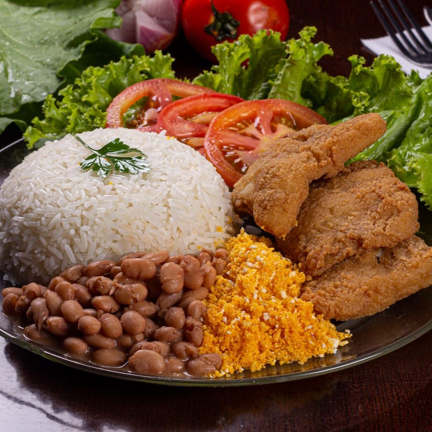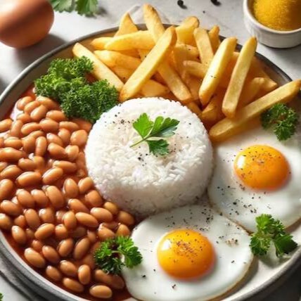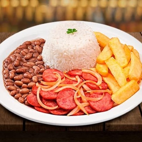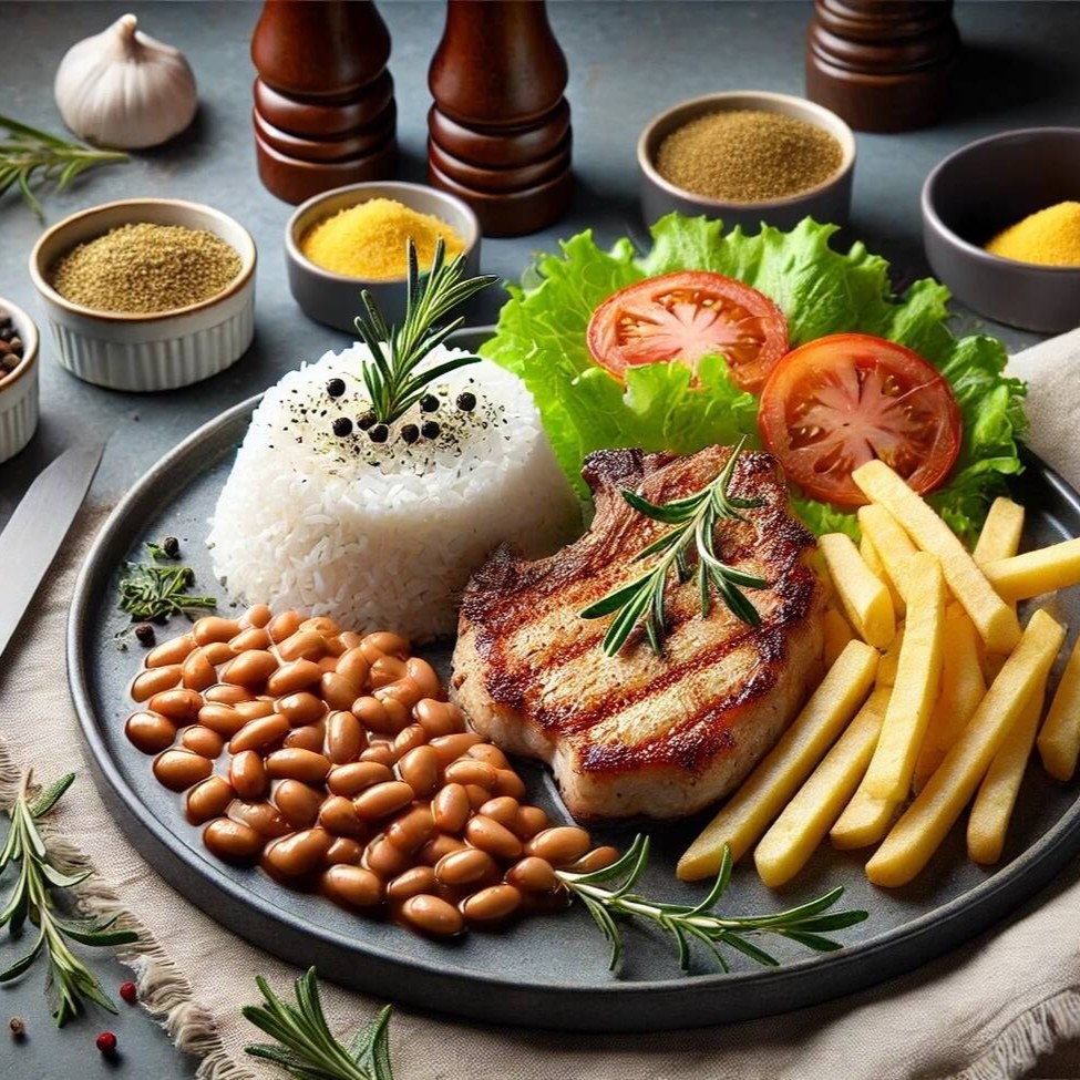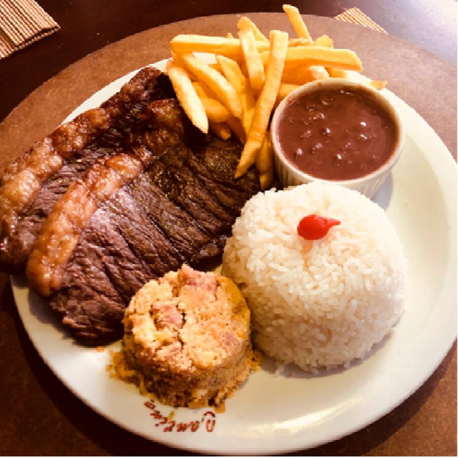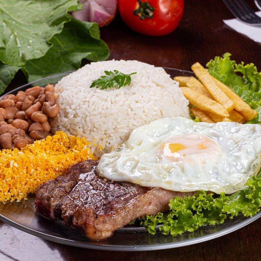 Prato Completo: Bisteca: Deliciosa bisteca grelhada, suculenta e bem temperada, com um leve toque de ervas. Arroz: Arroz branco soltinho, cozido no ponto certo, perfeito para acompanhar a refeição. Feijão: carioca, temperado com alho e cebola, com caldo espesso e saboroso. Farofa: Farofa crocante, feita com farinha de mandioca, , adicionando uma textura especial ao prato. Batata Frita: Batatas f