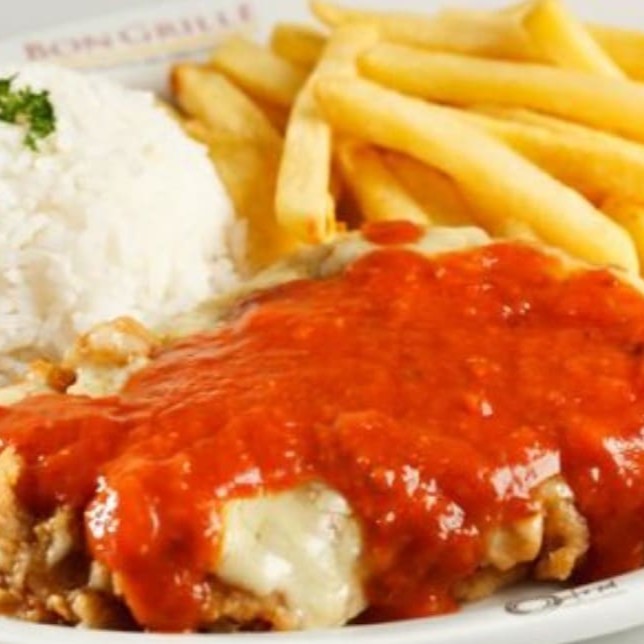 Um suculento bife de carne bovina, que é empanado e frito até ficar crocante. Após a fritura, o bife é coberto com uma generosa camada de molho de tomate e uma mistura de queijos, como muçarela e parmesão, que são gratinados no forno até derreterem mais uma coca cola grande de 2 litros