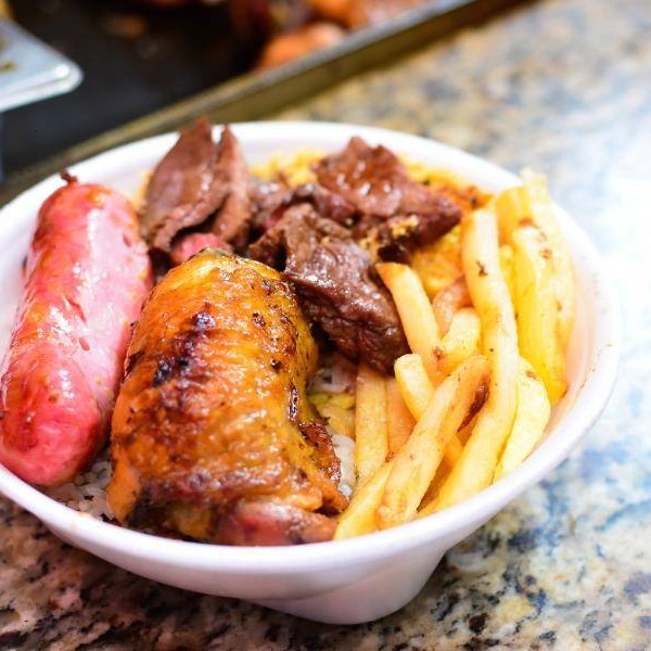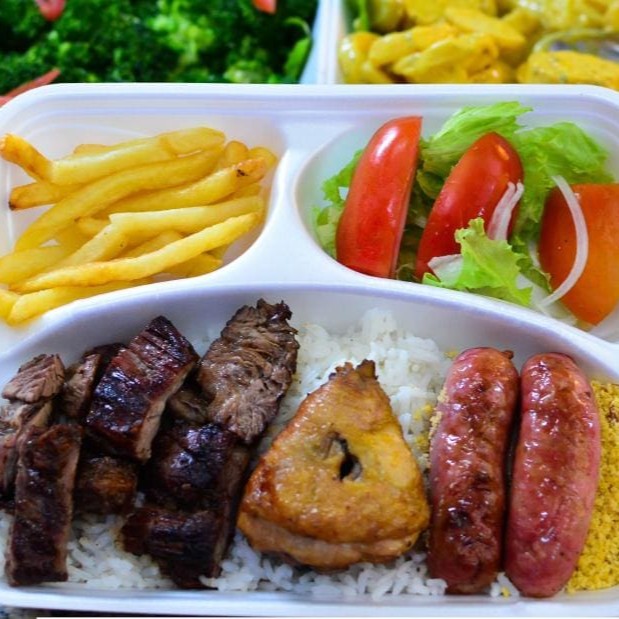 Delicie-se com nosso 'Marmitex Misto de Churrasco', um dos destaques de nosso cardápio. Este banquete é recheado com uma variedade de carnes suculentas e bem temperadas, incluindo linguiça assada, frango assado e fraldinha assada, todos meticulosamente preparados para despertar seu paladar. O prato é complementado com acompanhamentos clássicos e amados por todos: um arroz soltinho e bem temperado,