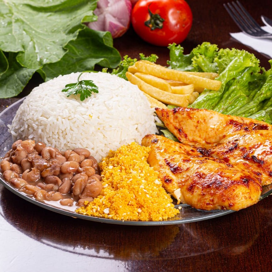 O Prato de Frango Grelhado na Churrasqueira a Carvão, da categoria Pratos Comerciais, é uma experiência culinária completa. Acompanhado de um tenro filé de frango, perfeitamente grelhado, o prato é servido com um arroz soltinho e branco, além de um feijão caseiro, rico e encorpado. Uma farofa crocante adiciona um toque especial, junto a uma porção generosa de batatas fritas, douradas e crocantes.