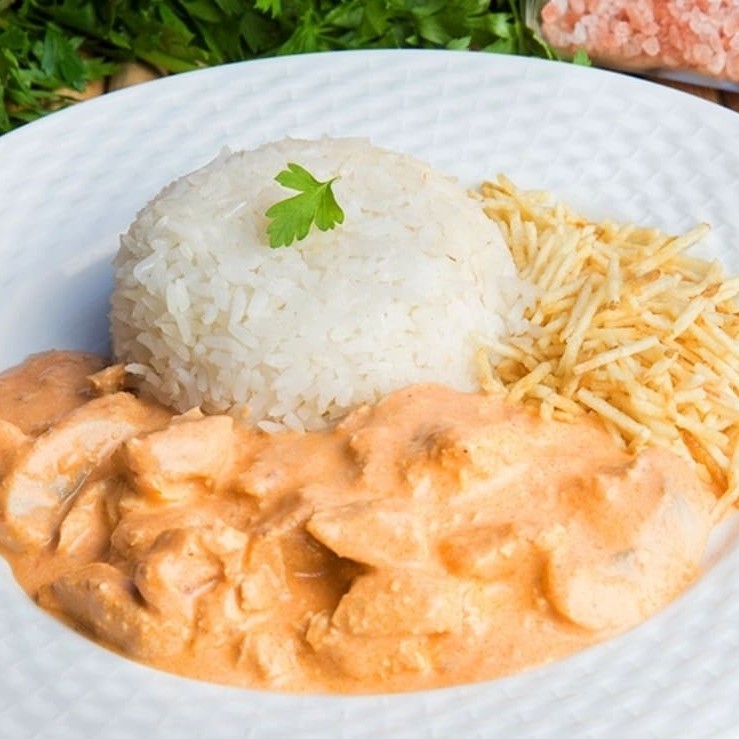 Acompanha :estrogonofe de frango ,arroz ,feijão ,batata palha