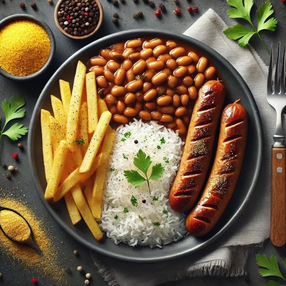 Linguiça toscana assada ,arroz feijao farofa e batata frita