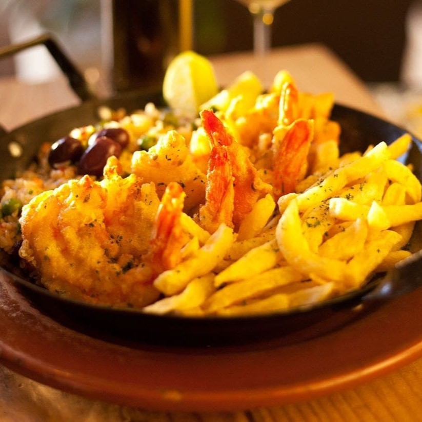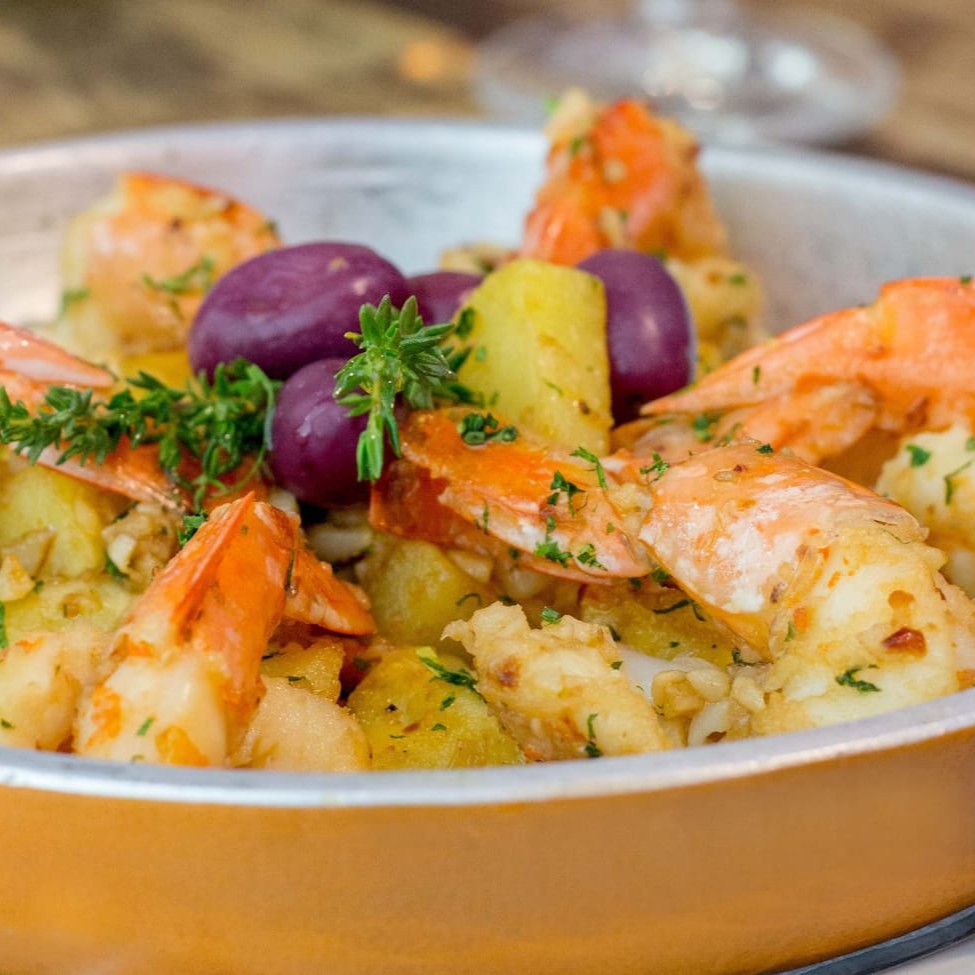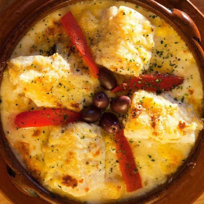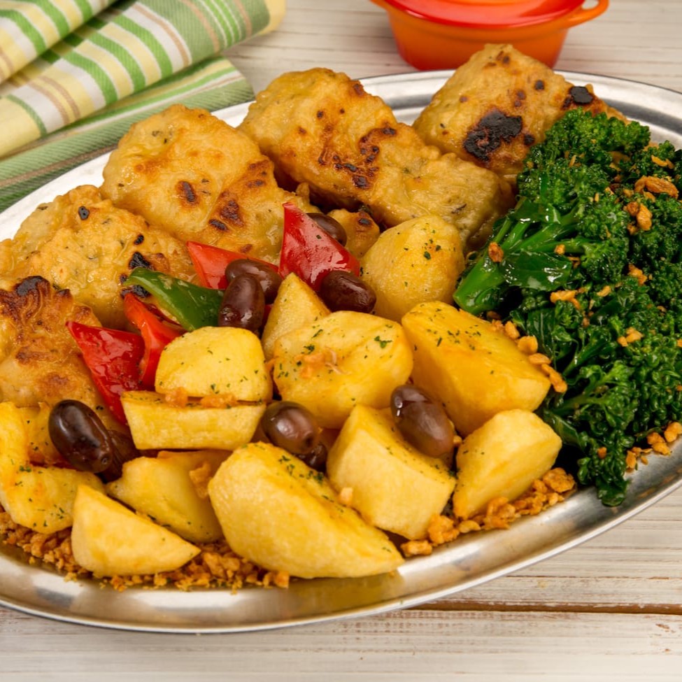 Bacalhau em nacos empanados. Acompanha batatas cozidas, azeitonas portuguesas, molho de tomates com camarões. Tudo coberto por mussarela e gratinado no forno.