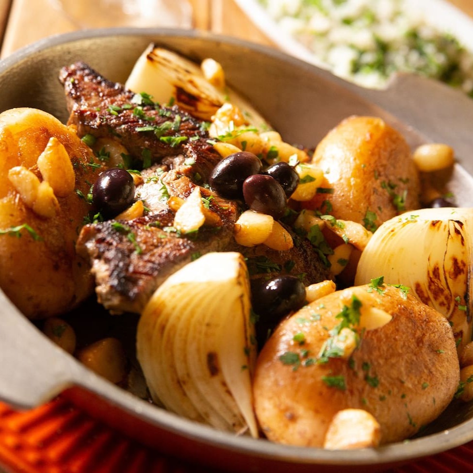 Posta inteira assada com batatas ao murro, alho em fatias, cebolas, pimentões, brócoles e azeitonas portuguesas.