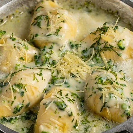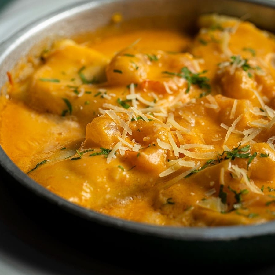 Massa em forma de travesseiros, recheada com queijo brie, nozes e pêra, ao molho rosê de camarões.