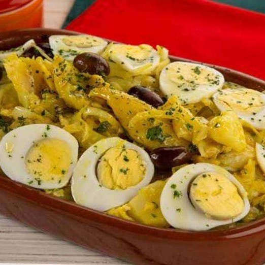 Bacalhau aos nacos, com batatas cozidas, pimentões, cebola, alho, ovos, e azeitonas portuguesas. Coberto por molho de tomate caseiro e azeite.