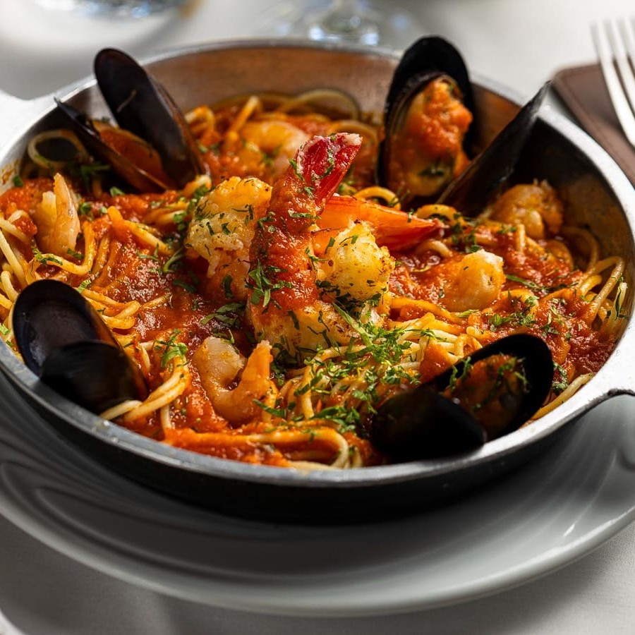 Espaguete ao molho vermelho com camarões, lulas, polvo, e mariscos.