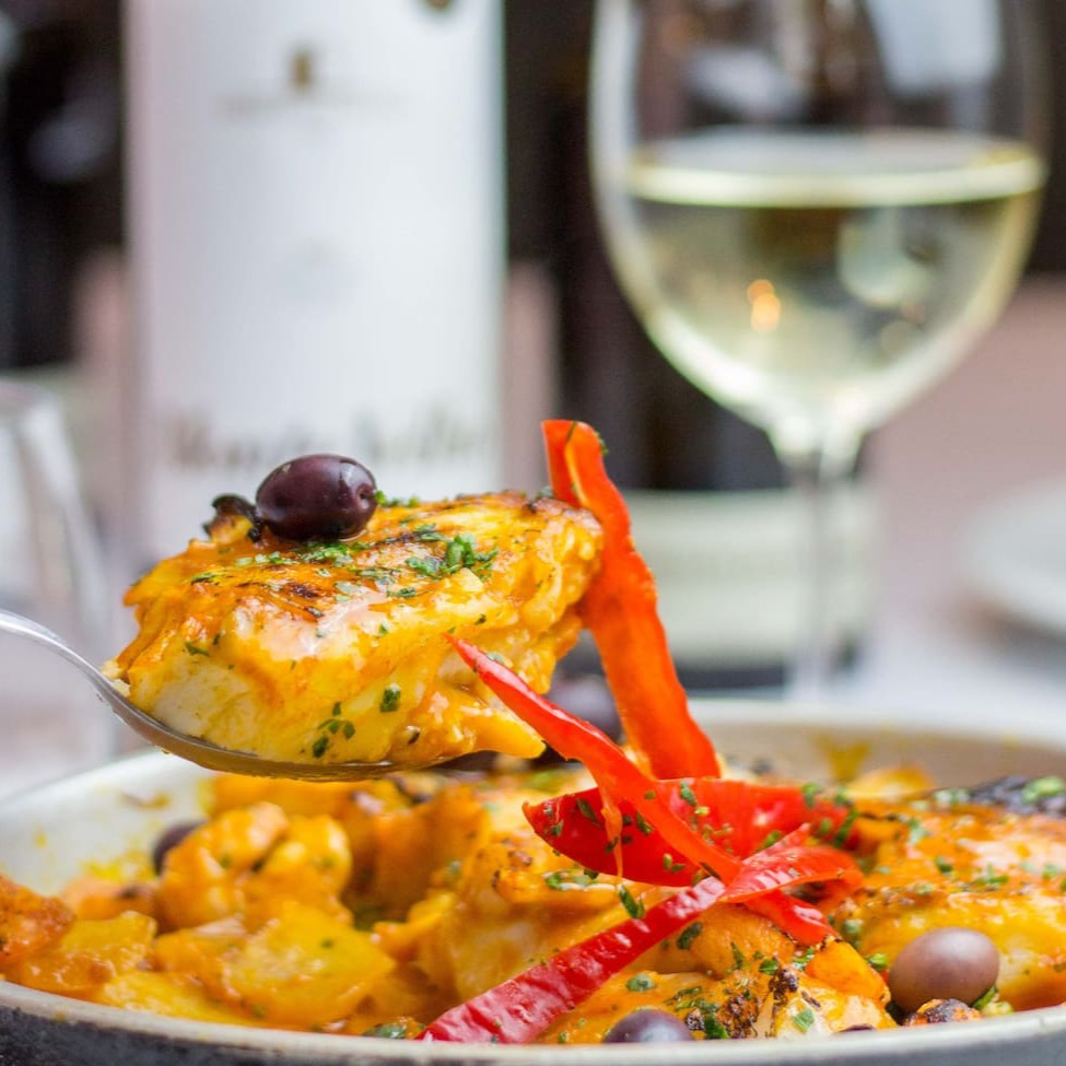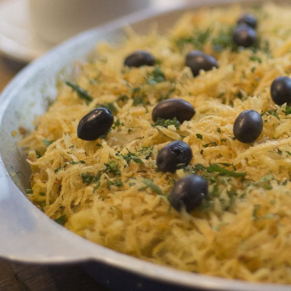 Bacalhau em lascas com batatas, puxados no azeite, com alho, cebola, açafrão espanhol, ovos e azeitonas portguesas.