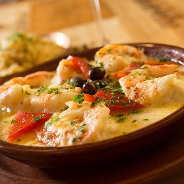Camarões limpos no molho a base de creme de leite fresco e Catupiry e batatas coradas, tudo gratinado ao forno. Acompanha arroz abacaxi.