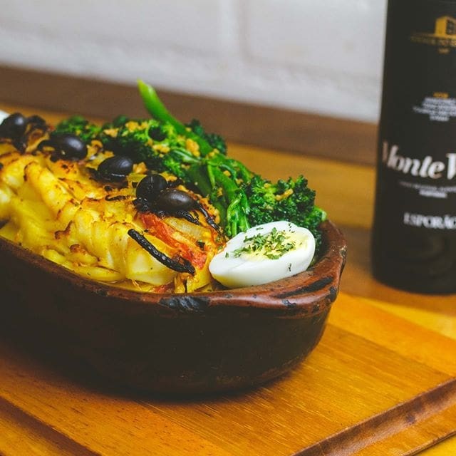 Bacalhau em nacos, com alho picado, cebolas em pétalas, pimentões, azeite, molho de tomates, leite de coco, azeitonas portuguesas, e pimenta dedo de moça.