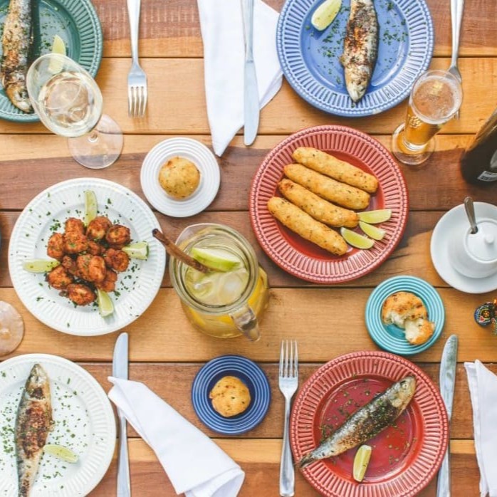 Sardinhas Portuguesas Grelhadas com batatas cozidas e pimentões vermelhos. Acompanha: 2 Mini Bolinhos 1 Arroz de Brocolis 1 Pastél de Belém
