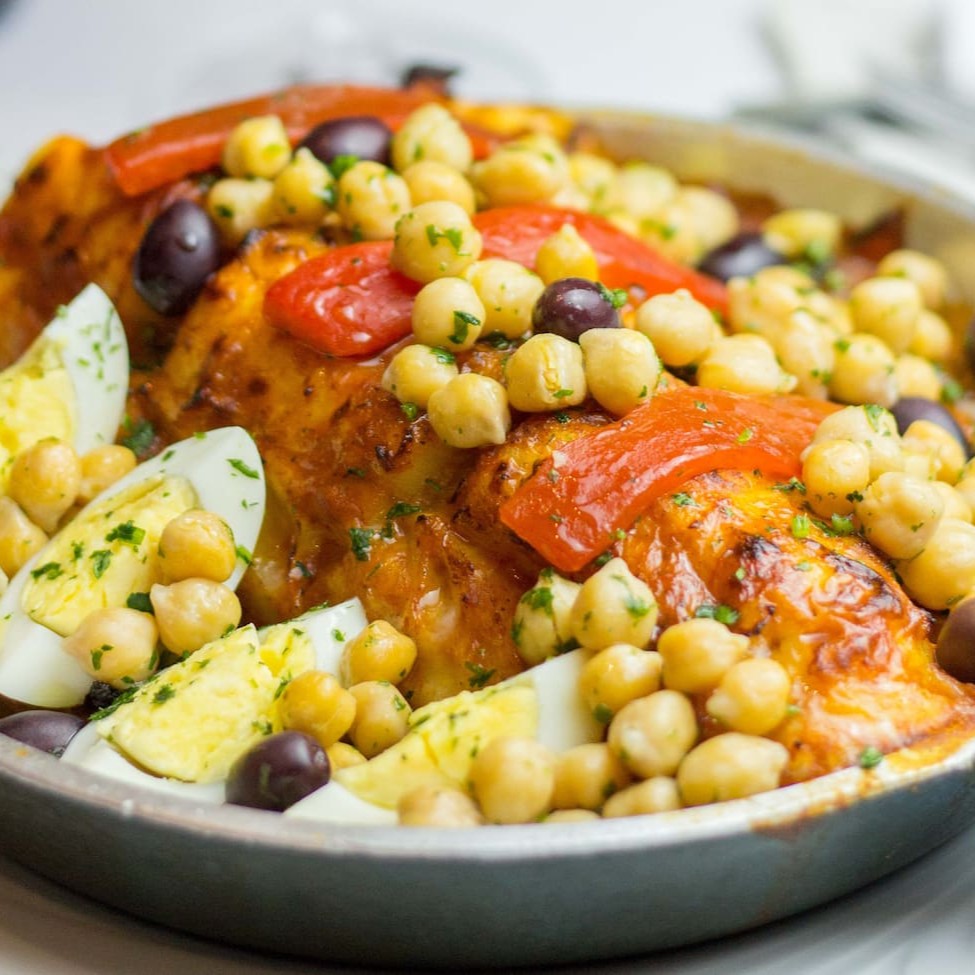 Posta inteira gratinada ao forno, com molho de tomates caseiro, cebolas, batatas, ovos, pimentões e grão de bico.