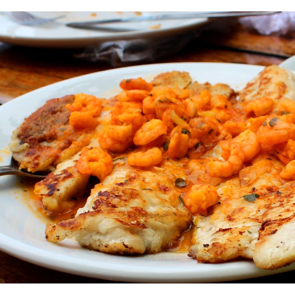 Pescada Branca À dorê, coberto por molho de tomate caseiro e camarões. Acompanha arroz branco e purê de batatas.