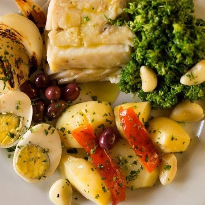 Posta inteira cozida, batatas cozidas, brócoles, cebola cozida, ovos e alho. Tudo regado no azeite.