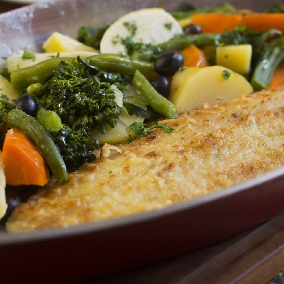 Pescada Branca Acompanha legumes (cenoura, batatas, brócoles, vagem e ervilhas)