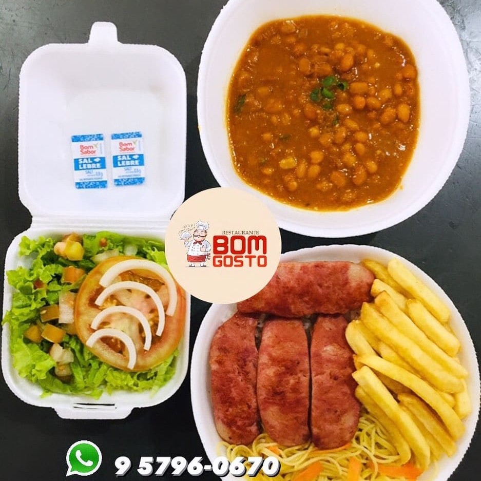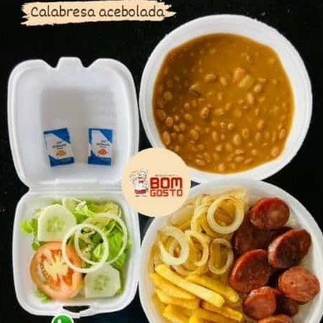 Marmita Calabresa Acebolada Arroz, Macarrão, Fritas e Salada. Feijão. #tags: hits - promoção - super - Calabresa - refeição - almoço - oferta - marmitaria - marmita