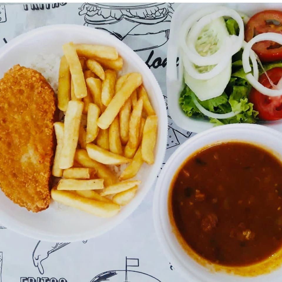 Arroz, 2 Hamburguer, Macarrão, Fritas, Ovo e salada. Feijão.