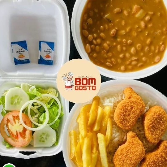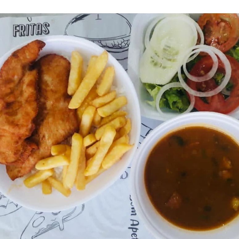 Arroz, Macarrão, Fritas e Salada. Feijão.