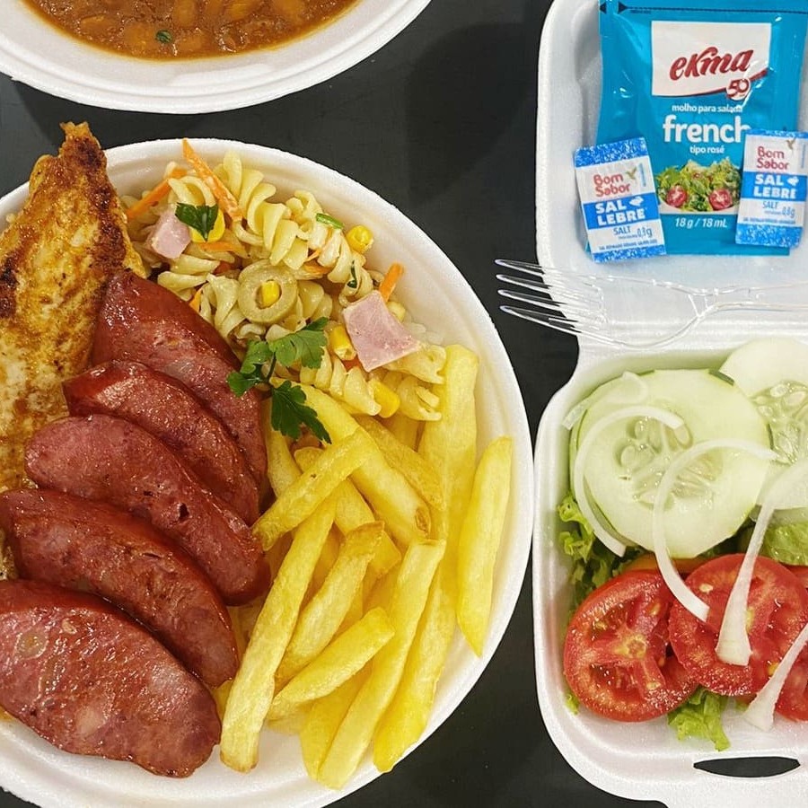 Arroz, feijão separado, macarrão, vinagrete, farofa, fritas e salada. Acompanha: 1 linguiça 1 Bife.