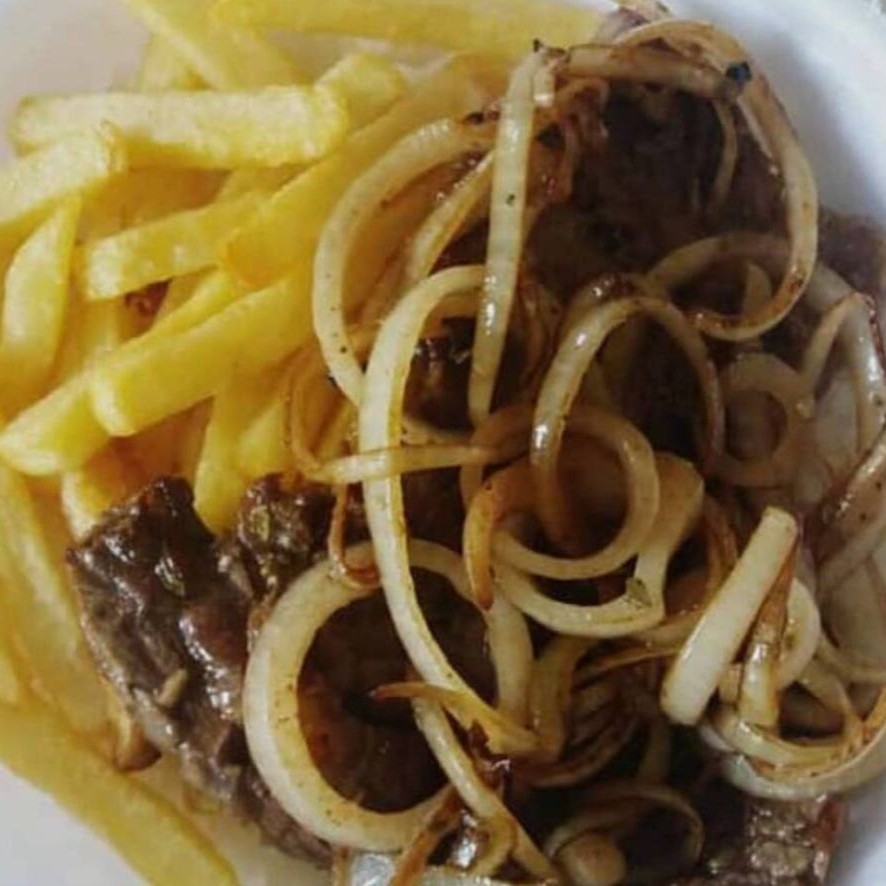 Filá Acebolado Arroz, Macarrão, Farofa, Fritas e salada. Feijão. #tags: hits - promoção - super - Carne - refeição - almoço - oferta - marmitaria - marmita