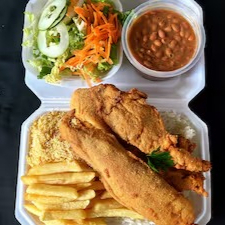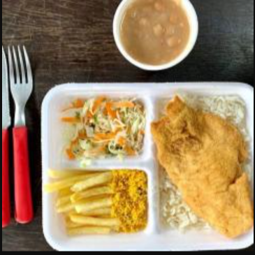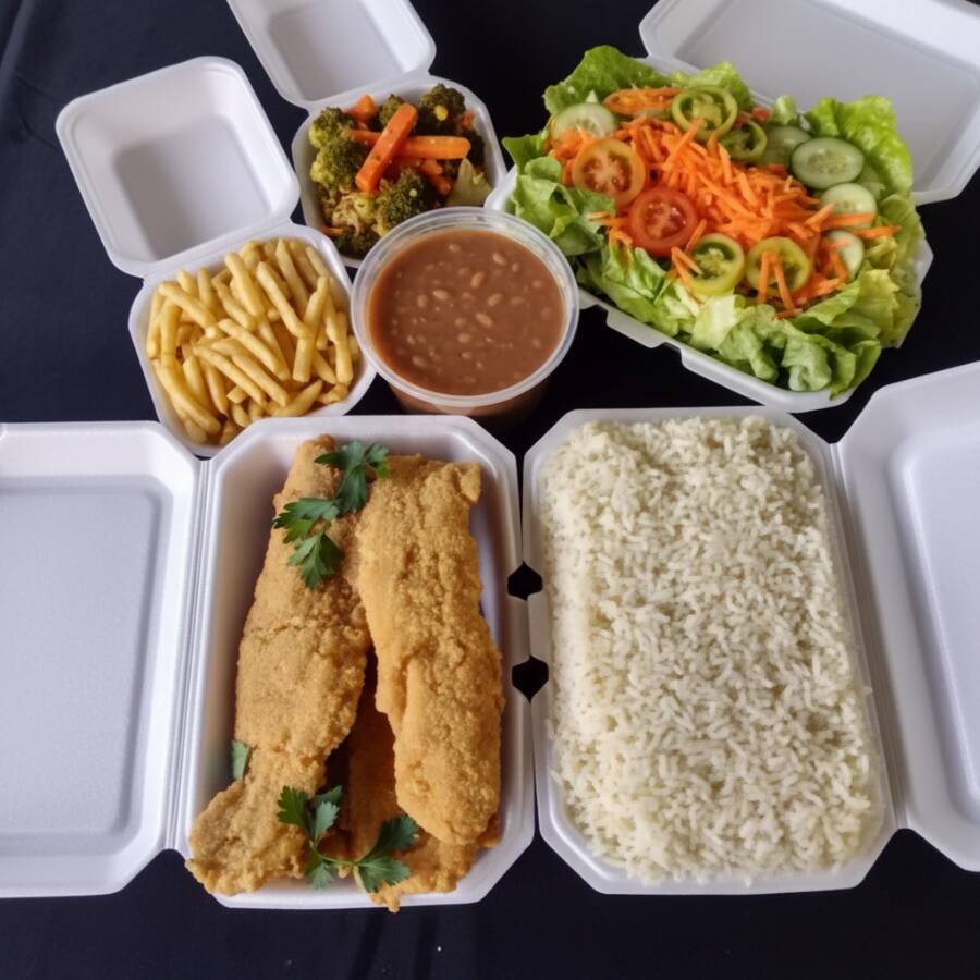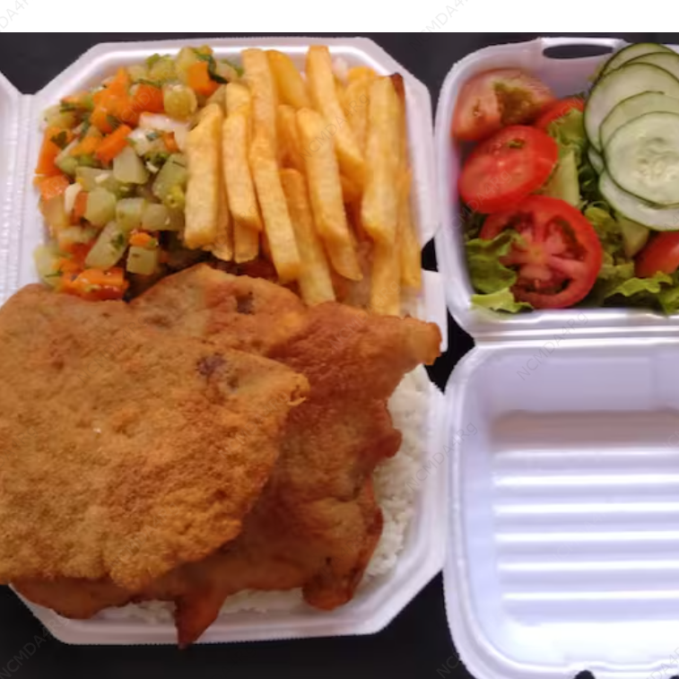 Marmitex saborosa com filé de peixe a milanesa, dois acompanhamentos, arroz, feijão separado e salada separada. Serve 2 pessoas