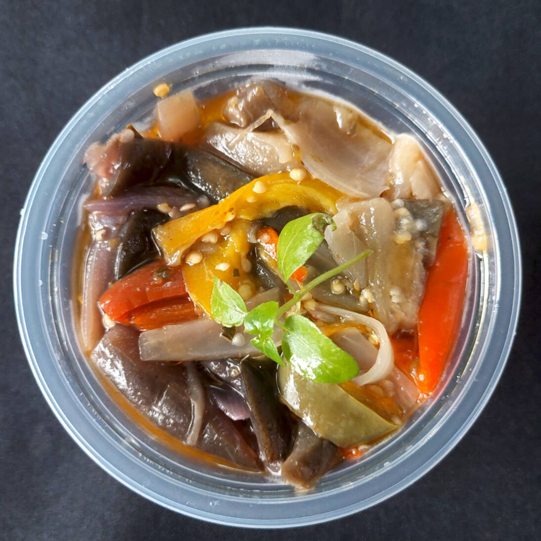 Antepasto de berinjela assada temperada com azeite, especiarias, cebola e pimentão. Pote 250 ml