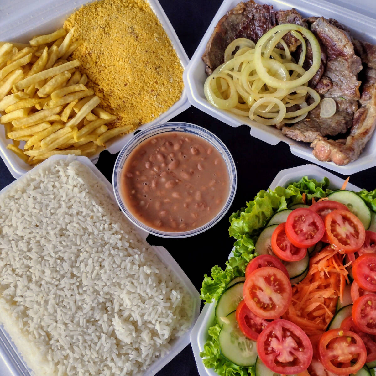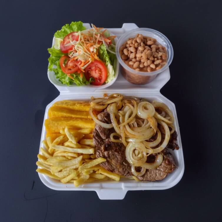 Marmitex saborosa com bife acebolado, dois acompanhamentos, arroz, feijão separado e salada separada. Serve 2 pessoas