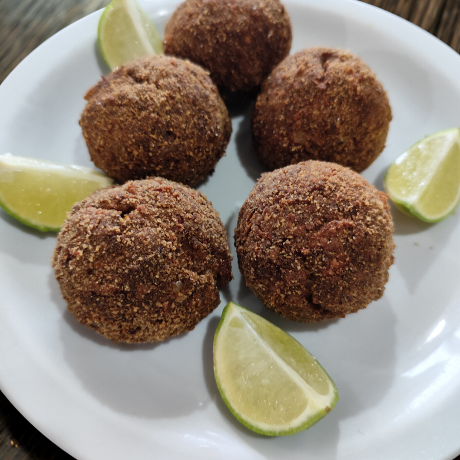 Neste bolinho vai carne, pão, mix de pimentas, no recheio queijo muçarela!