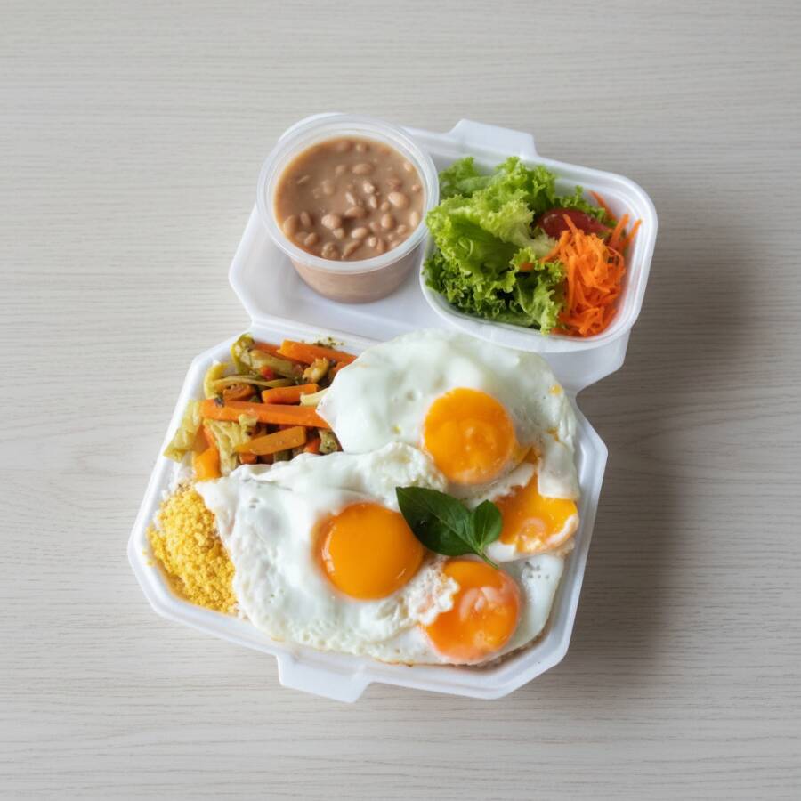 Marmitex ideal para duas pessoas, preenchida com arroz, quatro ovos fritos, dois acompanhamentos à sua escolha. O feijão saboroso e a salada do dia são servidos separadamente para preservar suas texturas e sabores. Uma refeição completa e gratificante que celebra a autêntica comida caseira. ** A salada do Dia é uma cortesia: Não é possível substituir por outros ingredientes