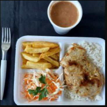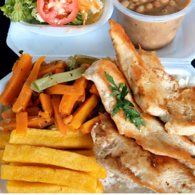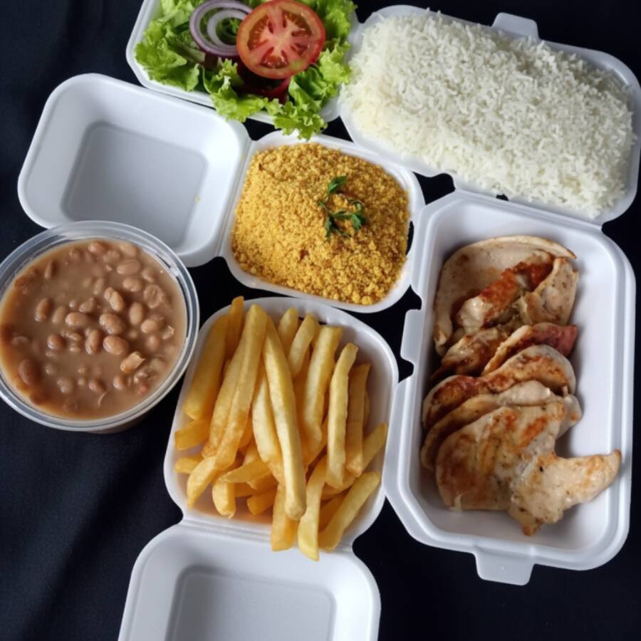 Deliciosa marmitex com filé de frango grelhado, dois acompanhamentos, arroz, feijão separado e salada separada. Serve 2 pessoas