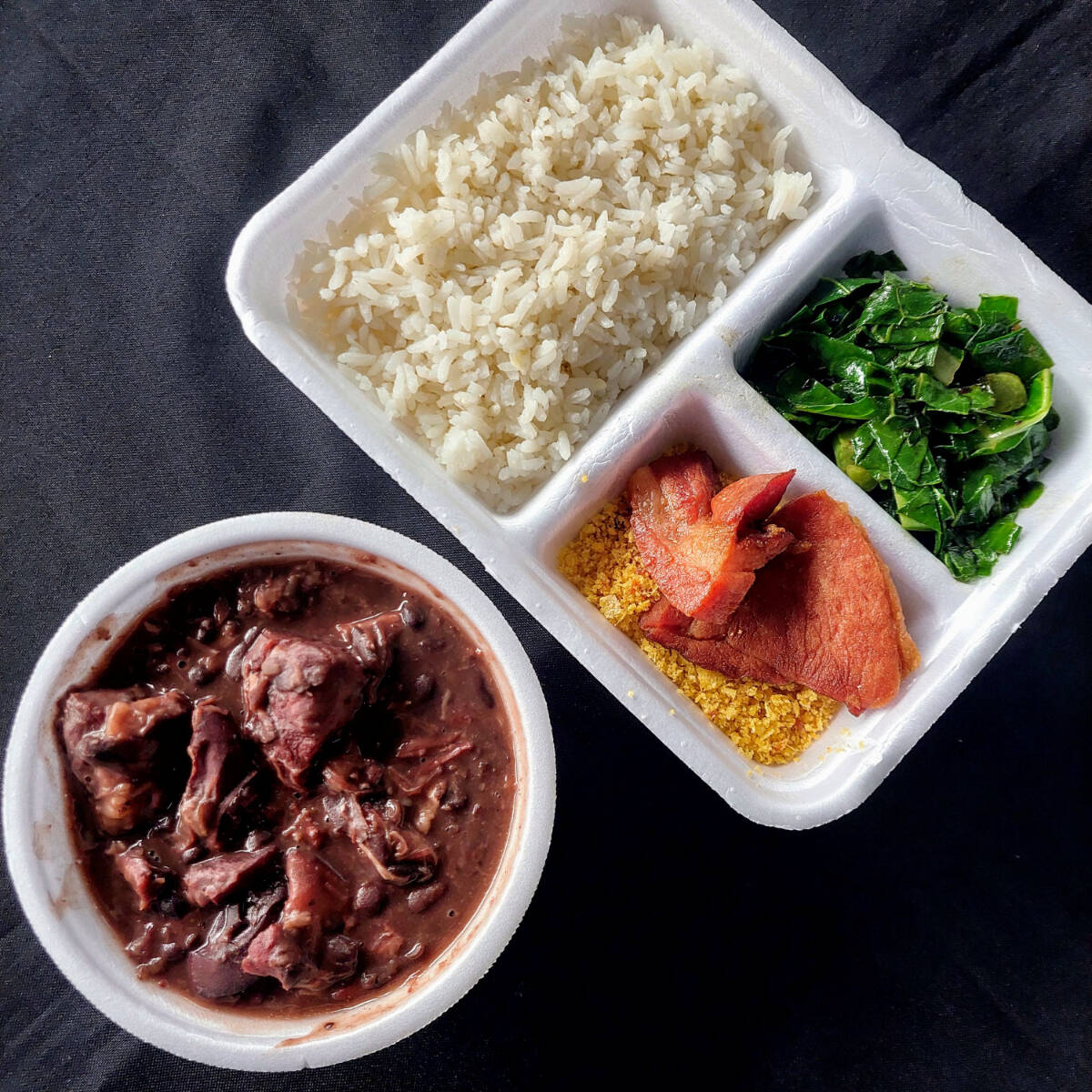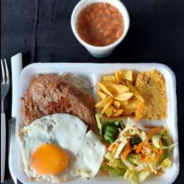 Serve 1 pessoa. Vai com arroz, feijoada, couve, farofa, bacon. Na feijoada vai lombo, carne seca e calabresa.