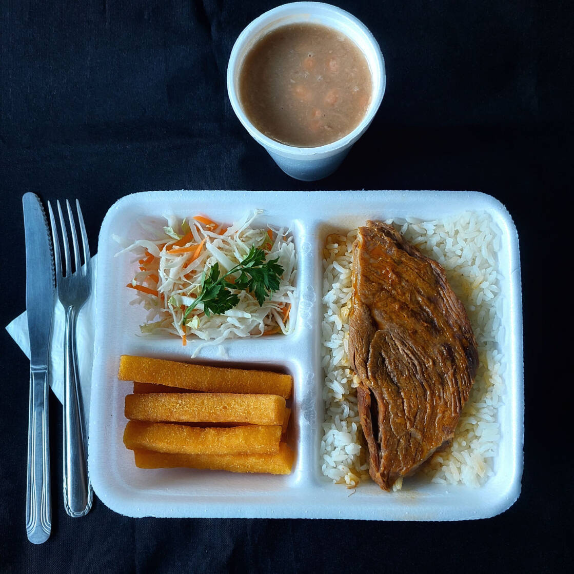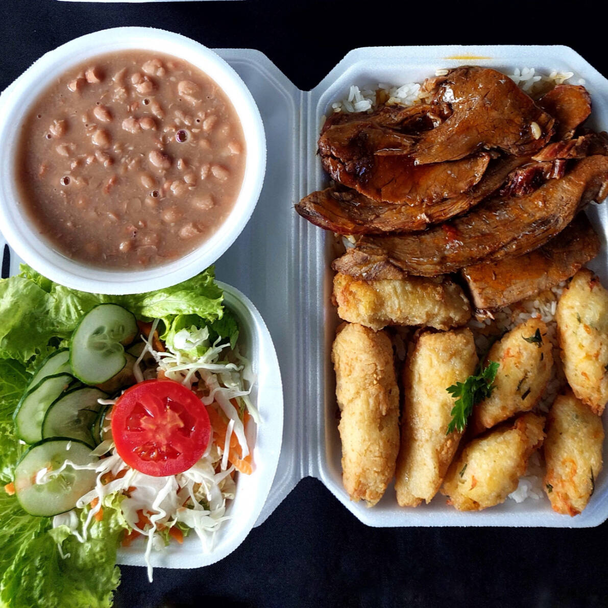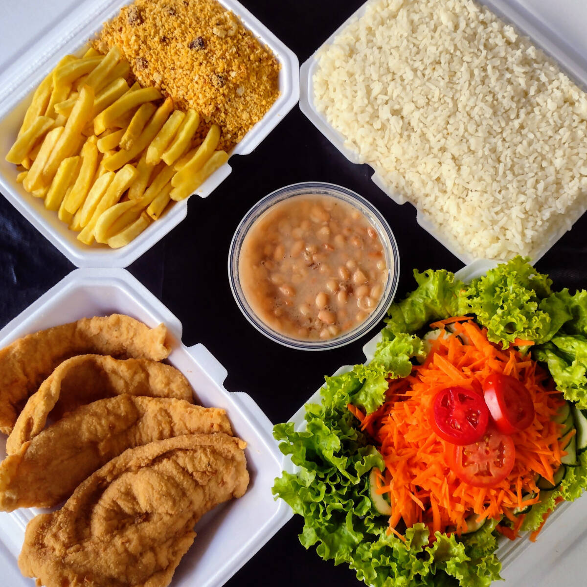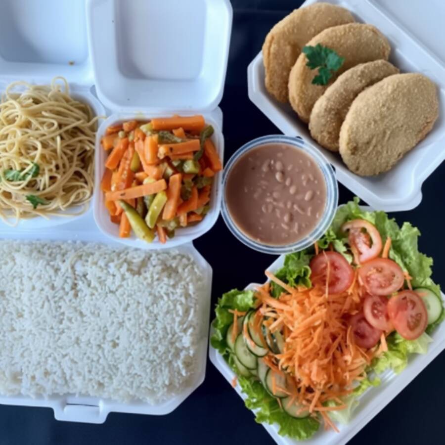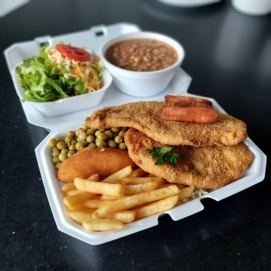 Marmitex com arroz, carne a milanesa, batata frita, banana a milanesa, ervilha na manteiga, fatia de bacon, feijão separado e salada separada.