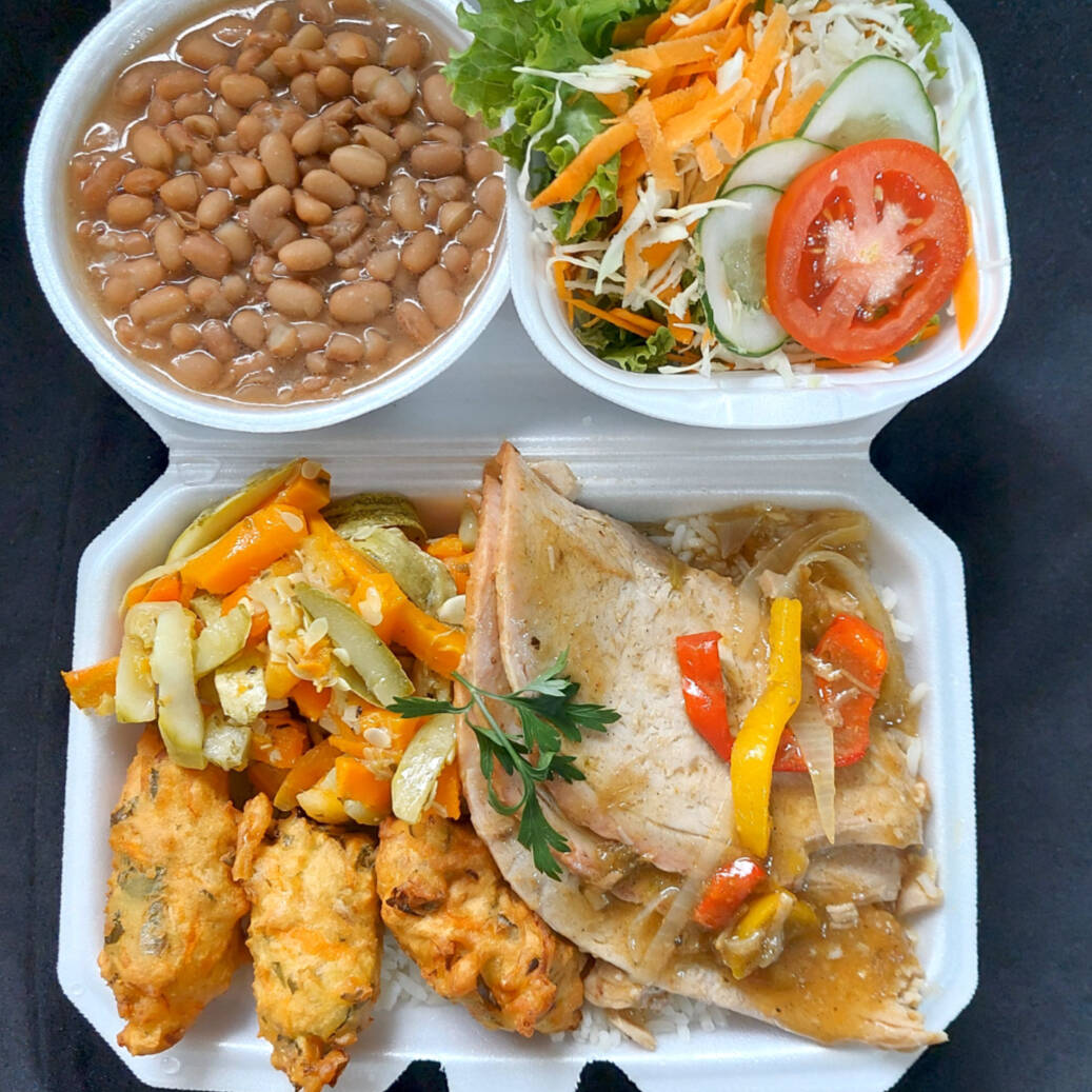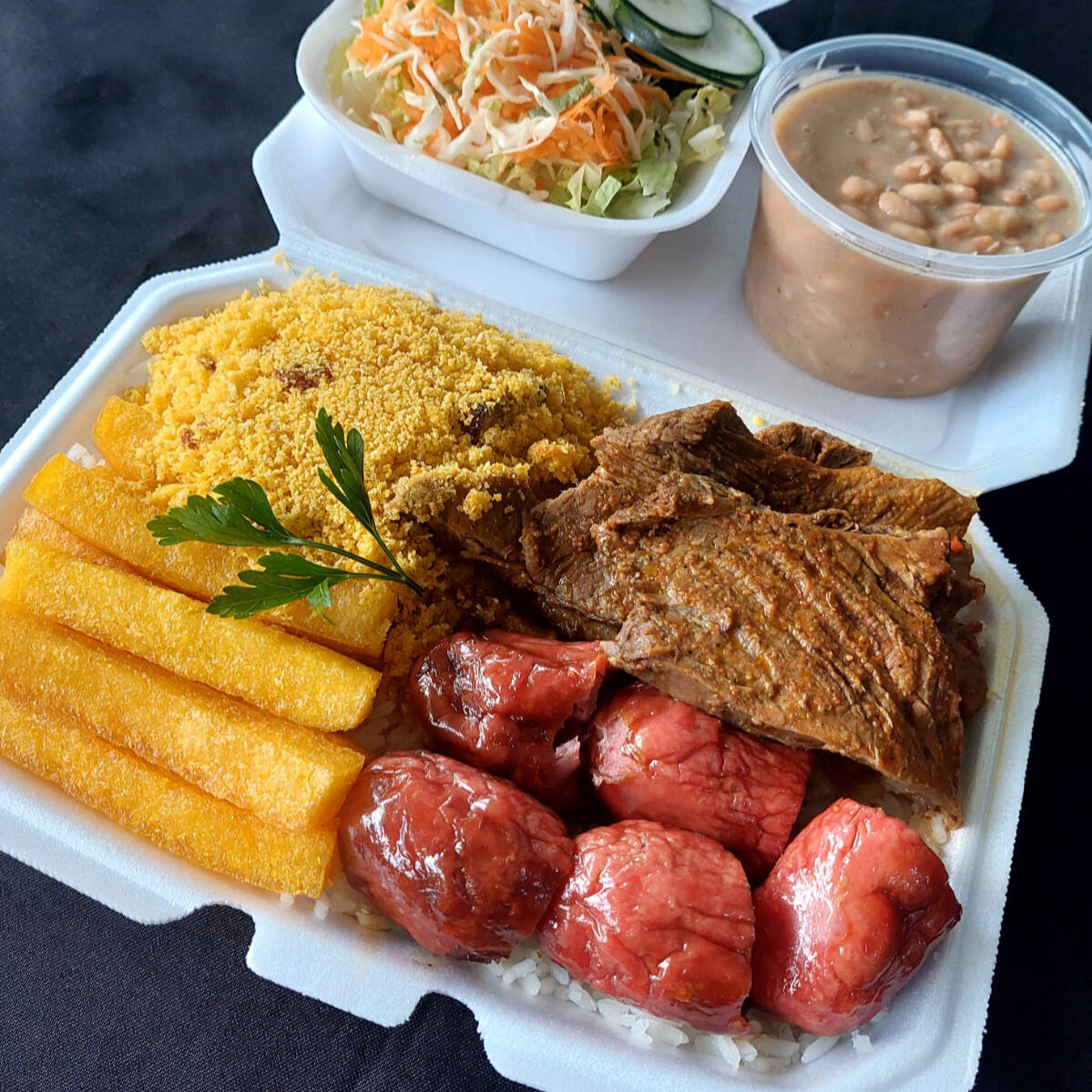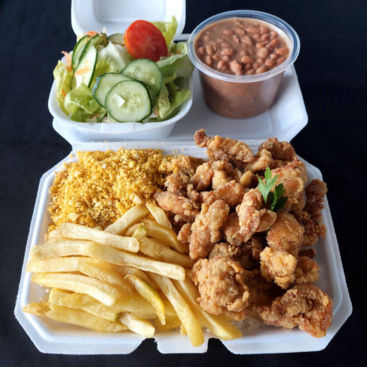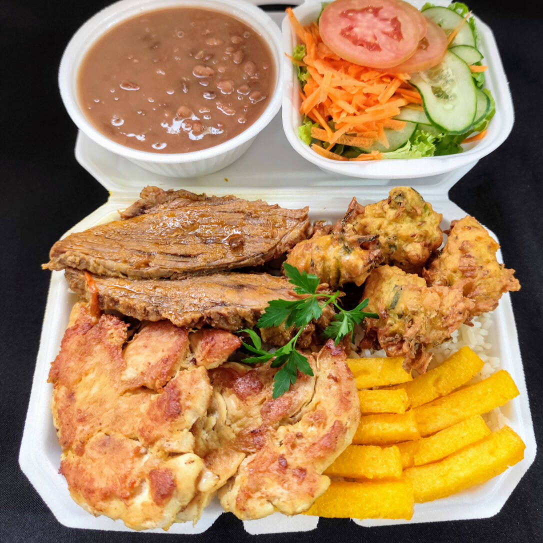 Marmitex com arroz, carne a milanesa, batata frita, banana a milanesa, ervilha na manteiga, fatia de bacon, feijão separado e salada separada.