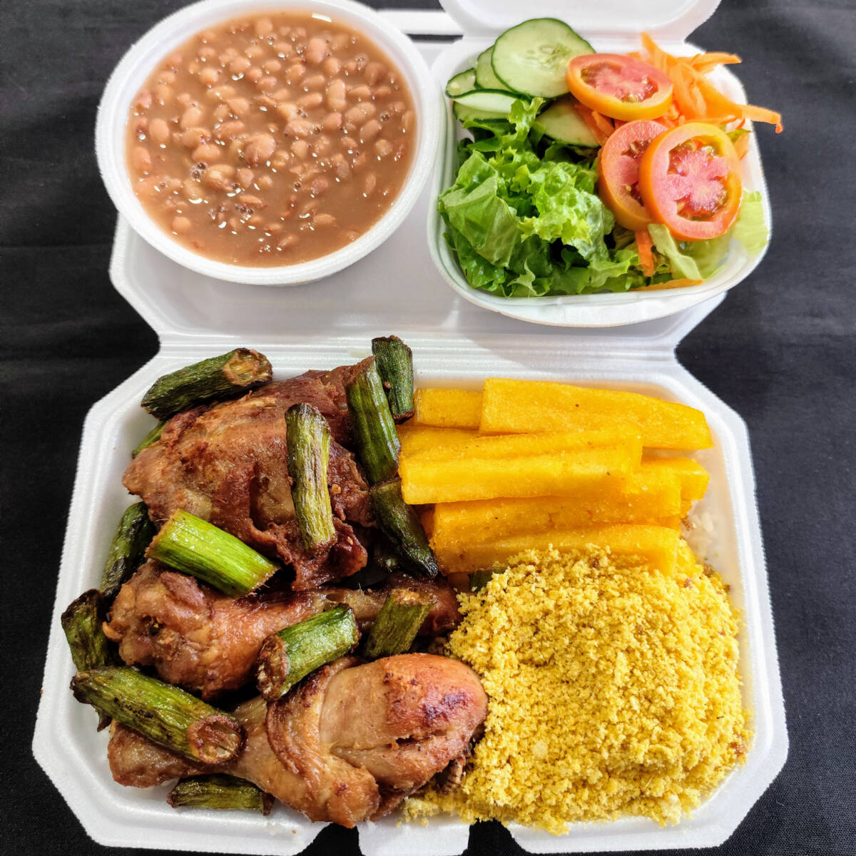 Delicie-se com nossa marmita 'Frango com Quiabo', uma seleção especial dentre nossos 'Pratos do Dia'. Apresenta uma saborosa combinação de coxa e sobrecoxa de frango, cuidadosamente temperadas e fritas para aprimorar o sabor, aliadas ao frescor do quiabo frito. O prato é acompanhado dos clássicos arroz e feijão, além de dois acompanhamentos de sua preferência, e uma salada crocante e refrescante. Desfrute dessa delícia as sextas feiras!