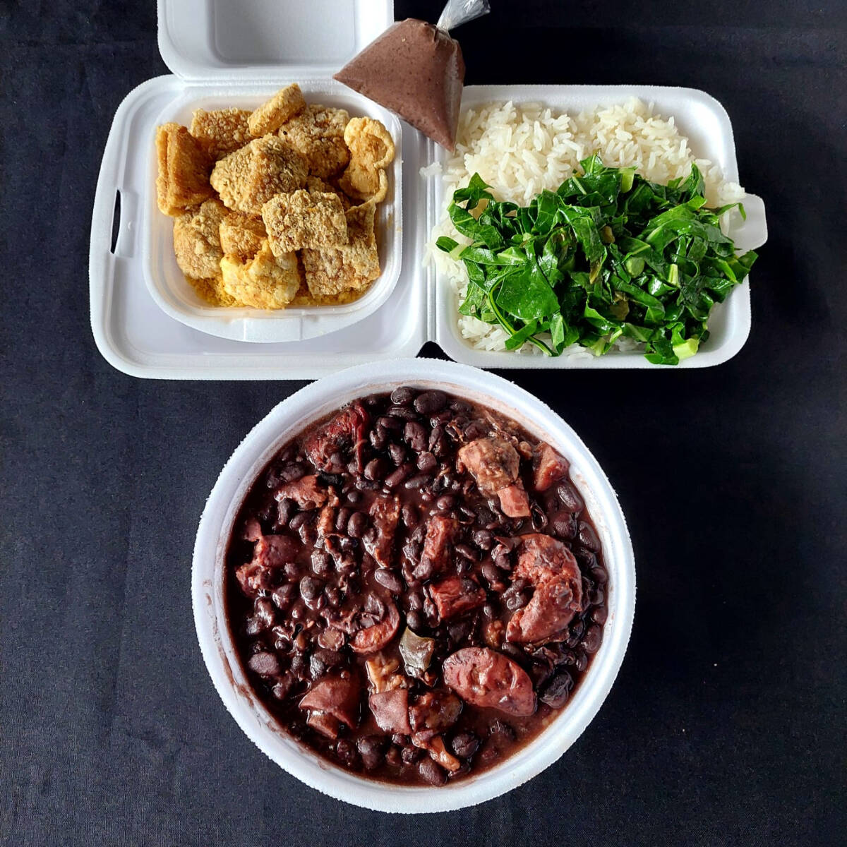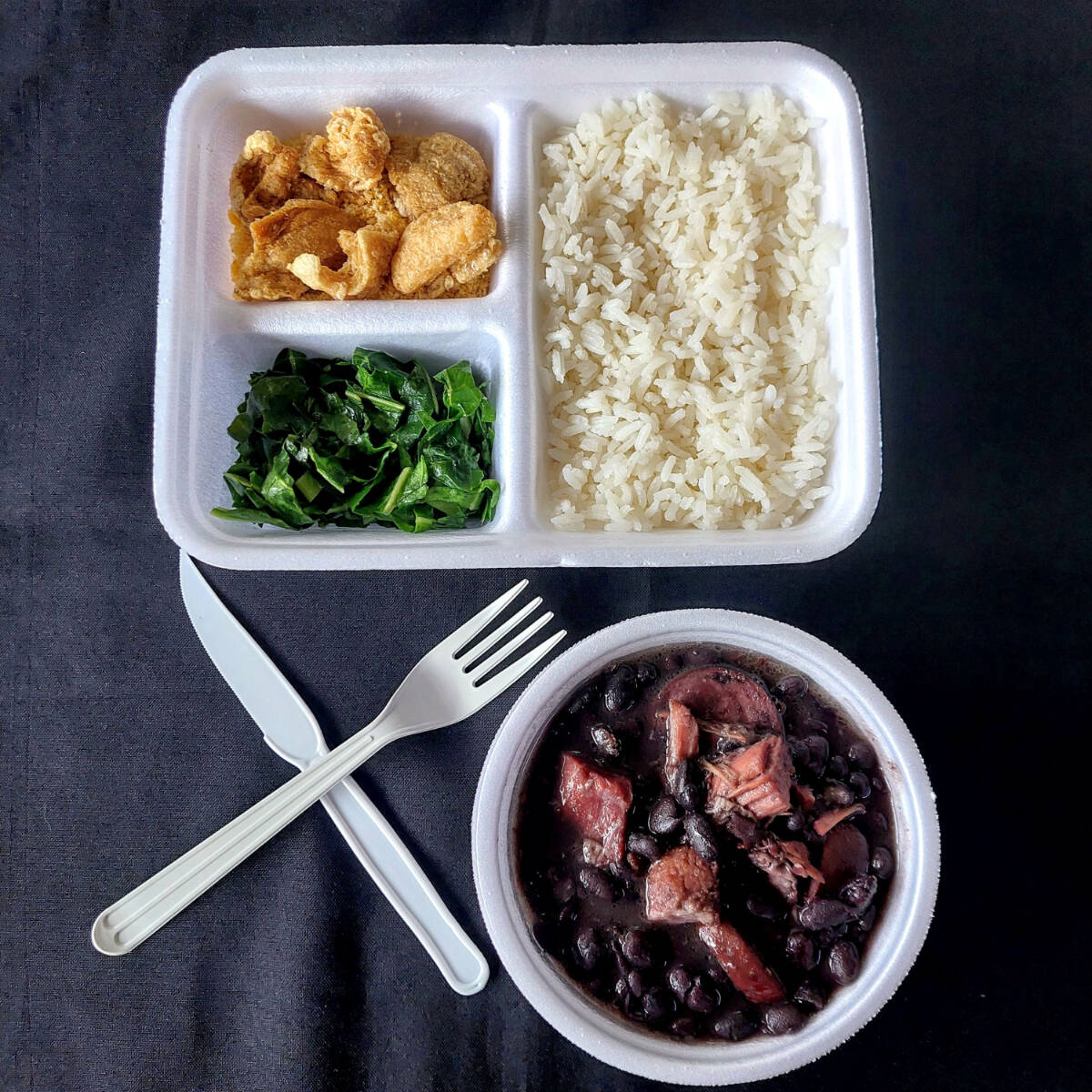 Serve 1 pessoa. Feijoada light (linguiça, lombo e carne seca) arroz, couve, farofa e torresmo