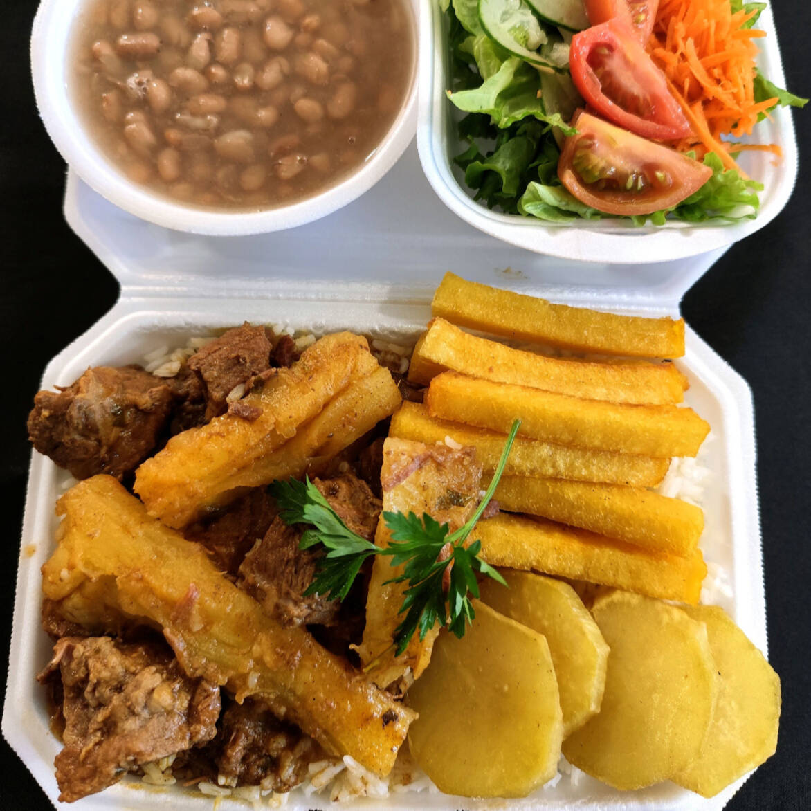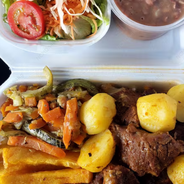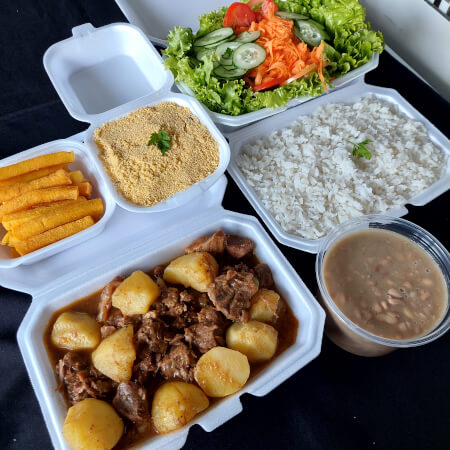 Marmitex saborosa com picadinho de carne com batata, dois acompanhamentos, arroz, feijão separado e salada separada. Serve 2 pessoas