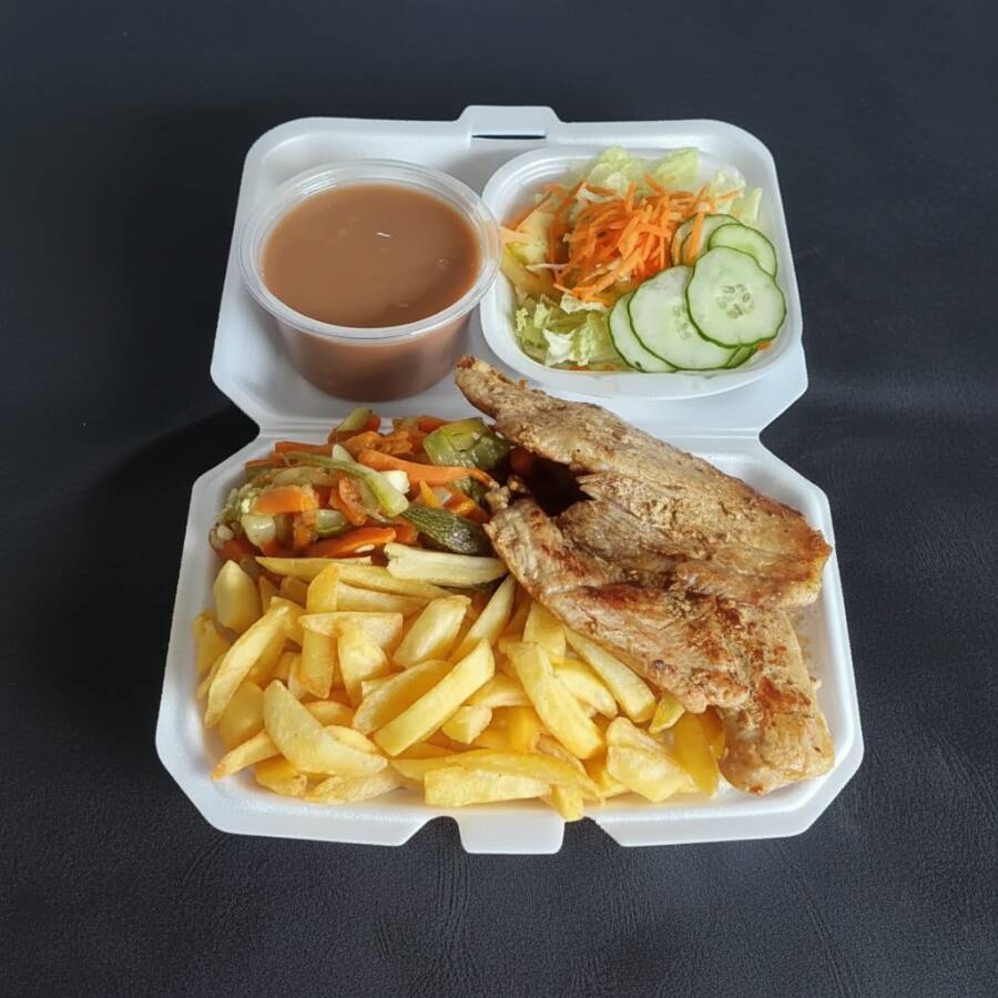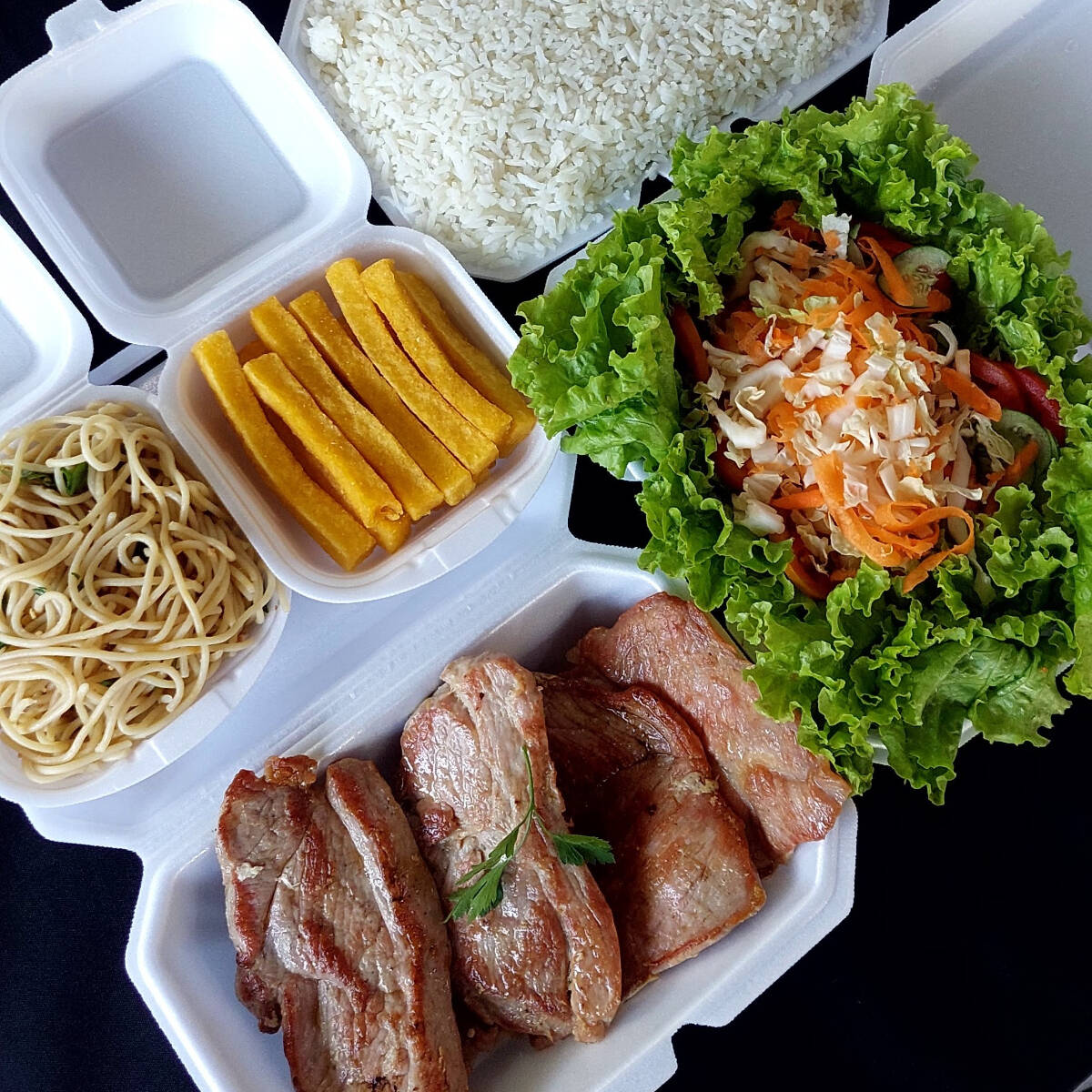Marmitex caprichada com lombo suíno grelhado, dois acompanhamentos, arroz, feijão separado e salada separada. Serve 2 pessoas