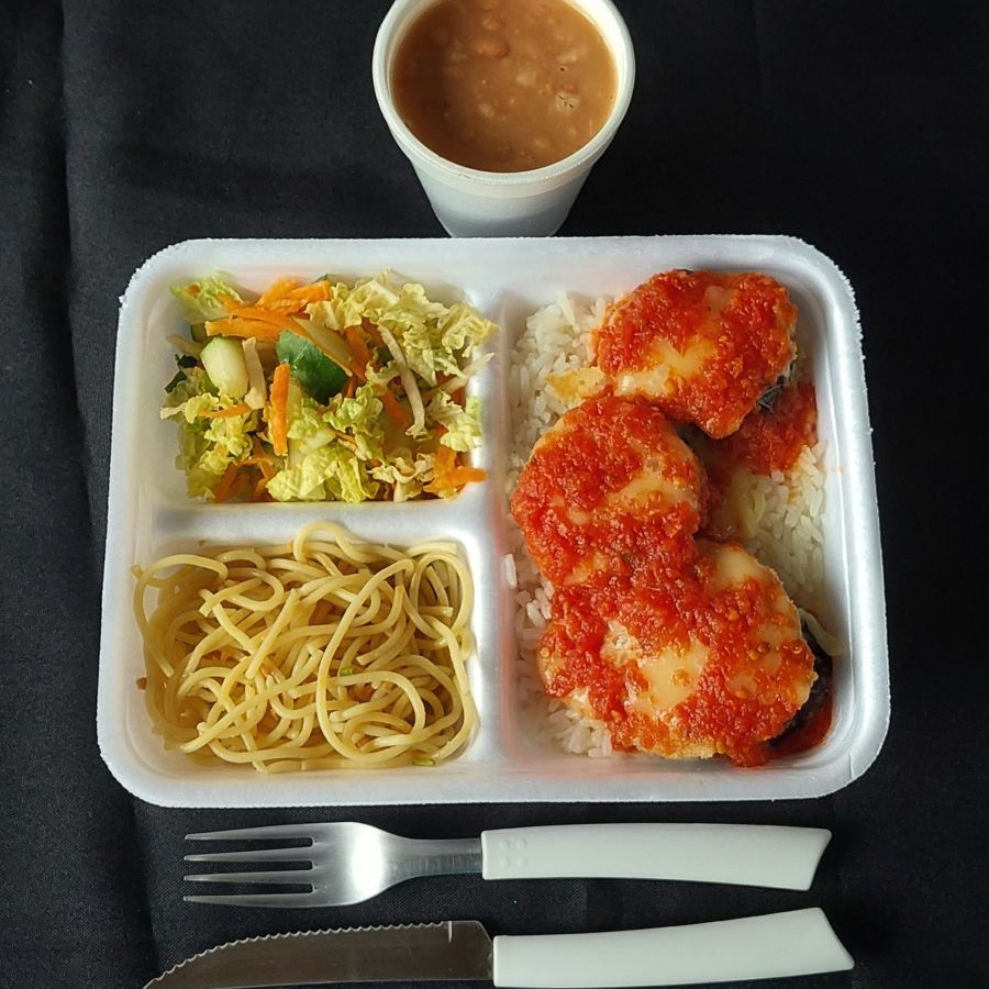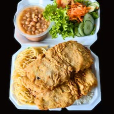 Marmitex saborosa com bife a milanesa, dois acompanhamentos, arroz, feijão separado e salada separada. Serve 2 pessoas