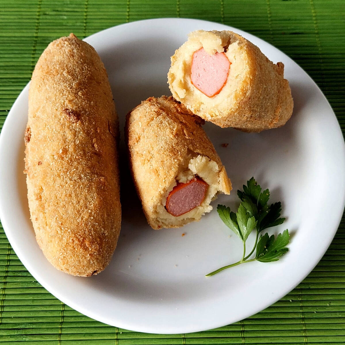 Tradicional bolinho feito com massa de batata, recheado com salsicha!