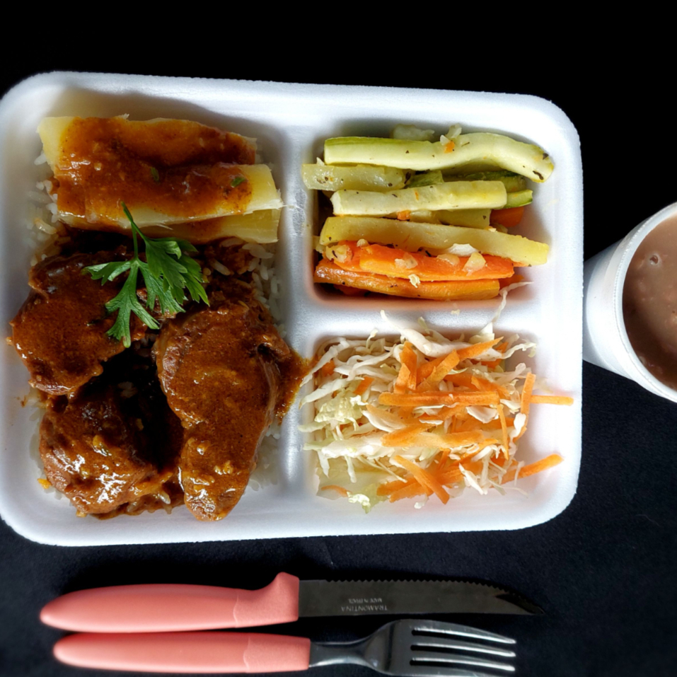 Saborosa 'Vaca Atolada', uma estrela na categoria 'Pratos do Dia'. Esta marmita, generosa e capaz de servir duas pessoas, abriga uma suculenta carne bovina cuidadosamente cozida até atingir a perfeição, combinada com mandioca macia e saborosa. Acompanhada de um arroz bem temperado e um feijão caseiro, além de dois complementos a sua escolha, para agradar ao seu paladar. Uma salada fresca e crocante dá o toque final a este prato. Disponível todas as terças-feiras para tornar o seu Dia mais saboroso e especial.