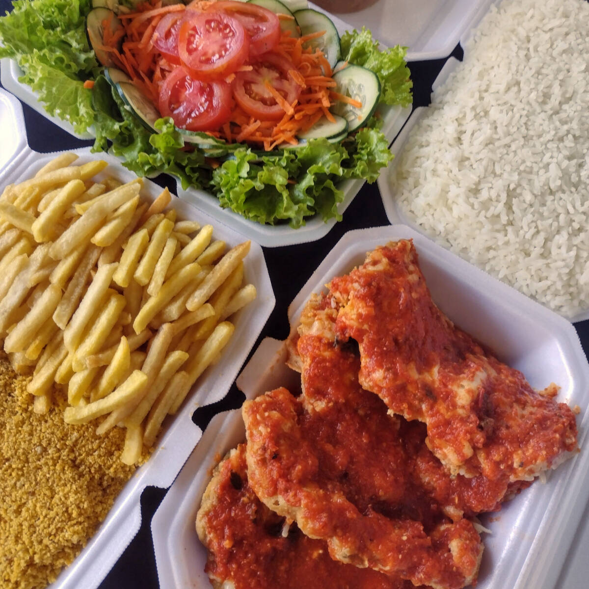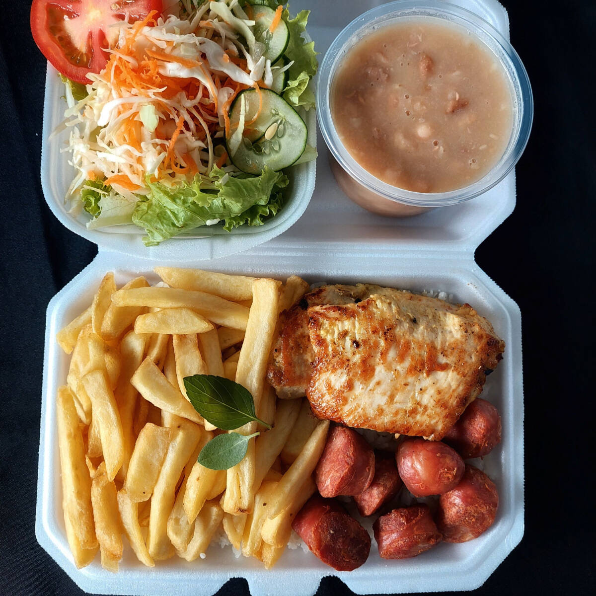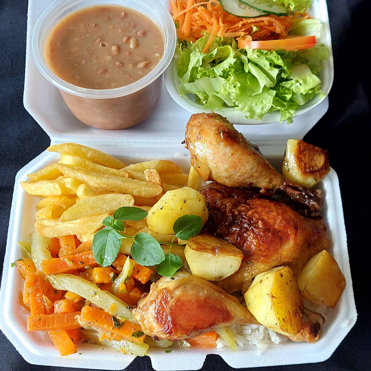 Marmitex com coxa e sobrecoxa de frango assada na churrasqueira a bafo, arroz, feijão, dois acompanhamentos a sua escolha e salada. Disponível aos Sábados e domingos