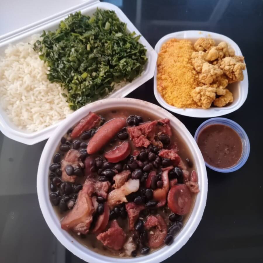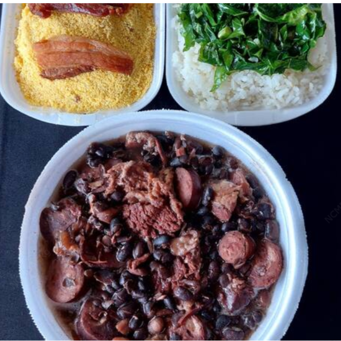 Serve 2 pessoas. Vai com arroz, feijoada, couve, farofa, bacon. Na feijoada vai lombo, carne seca e calabresa.