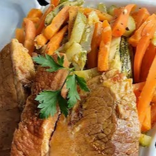 Delicioso Pernil Assado ao Molho de Vinho, servido em uma generosa marmita. Este prato disponível aos domingos, apresenta suculento pernil suíno, cuidadosamente assado até atingir a perfeição, e generosamente regado com nosso molho especial de vinho e pimentões, conferindo um sabor único e irresistível. Acompanha arroz, feijão fresquinho e uma refrescante salada, juntamente com dois acompanhamentos a sua escolha, enriquecendo ainda mais sua refeição. Esta marmita generosa, é ideal para compartilhar um momento saboroso. Experimente e se apaixone por cada mordida!