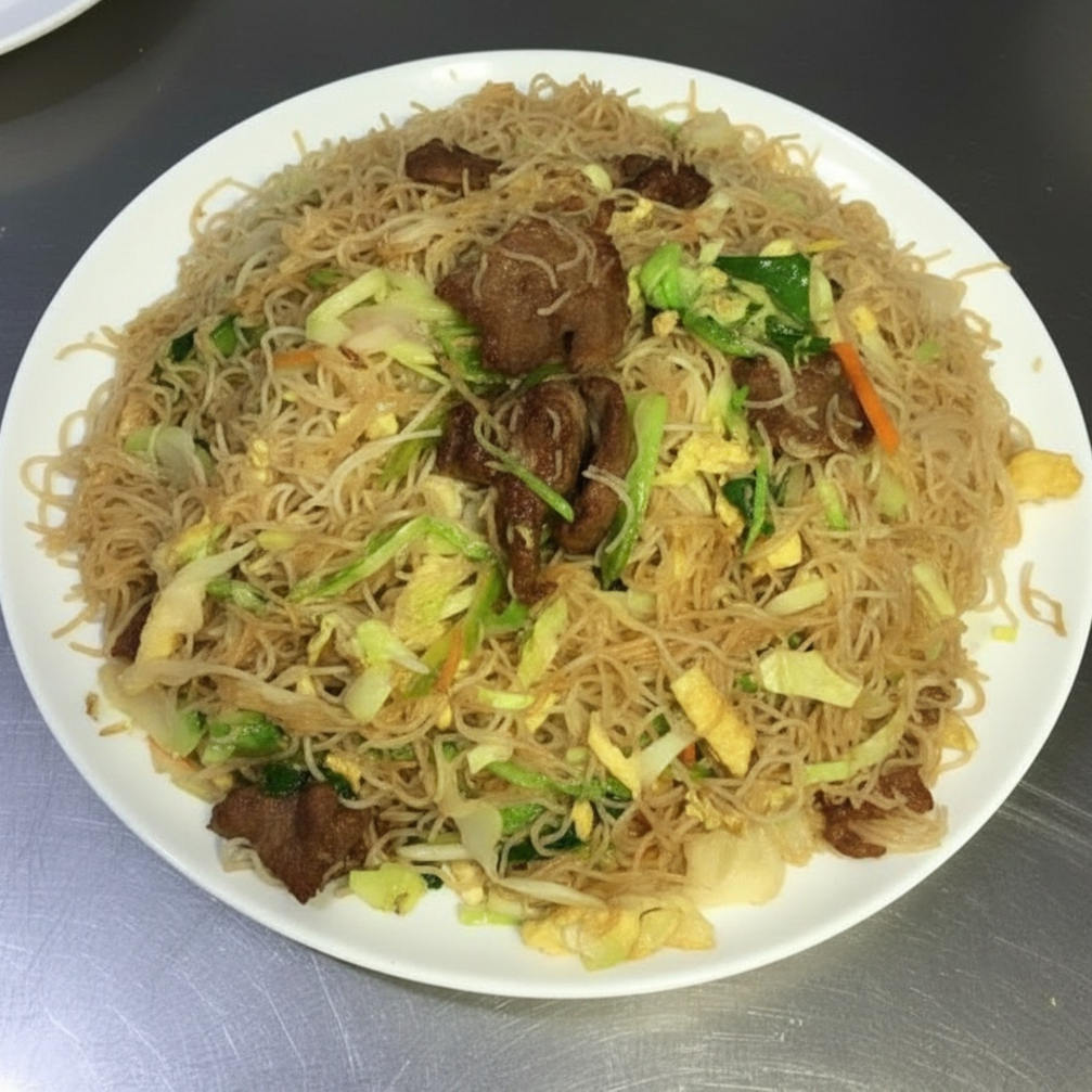 Ovo e macarrão de arroz,carne,cebola,repolho,cenoura,pimemtão com molho de soja frito na wok (padrão-1100ml-serve 2 pessoas)