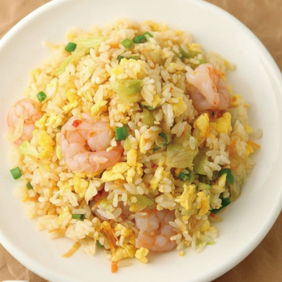 Arroz com ovo,camarão,cenoura,cebolinha com molho de soja na wok
