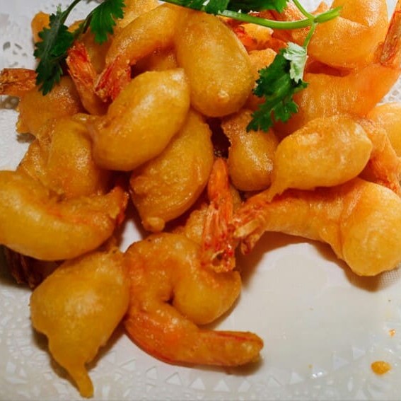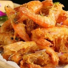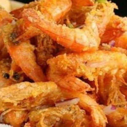 Camarão medio, fresco , sem cabeça , frito ,torrado na wok com alho, cebola,