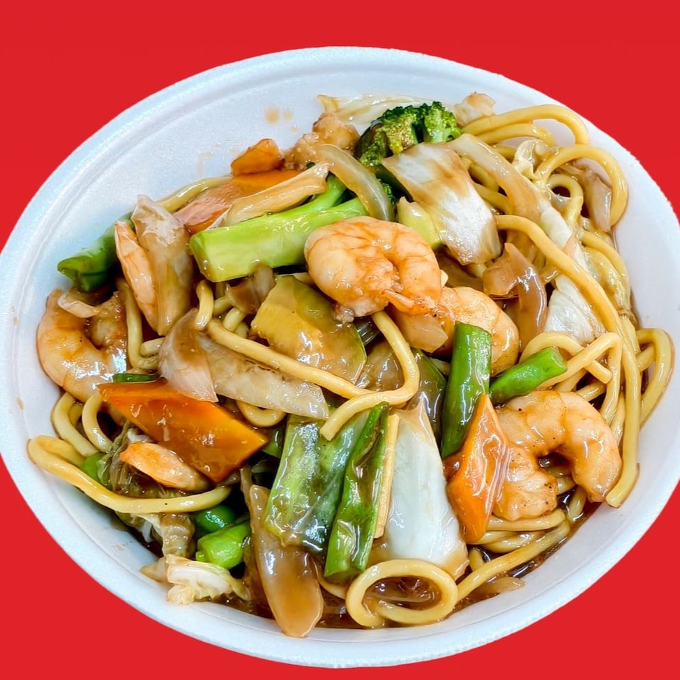 Macarrão com ovo e camarão,salmão,kani,cebola,repolho,cenoura,pimemtão com molho de soja frito na chapa (m:750ml)(g:1100ml)