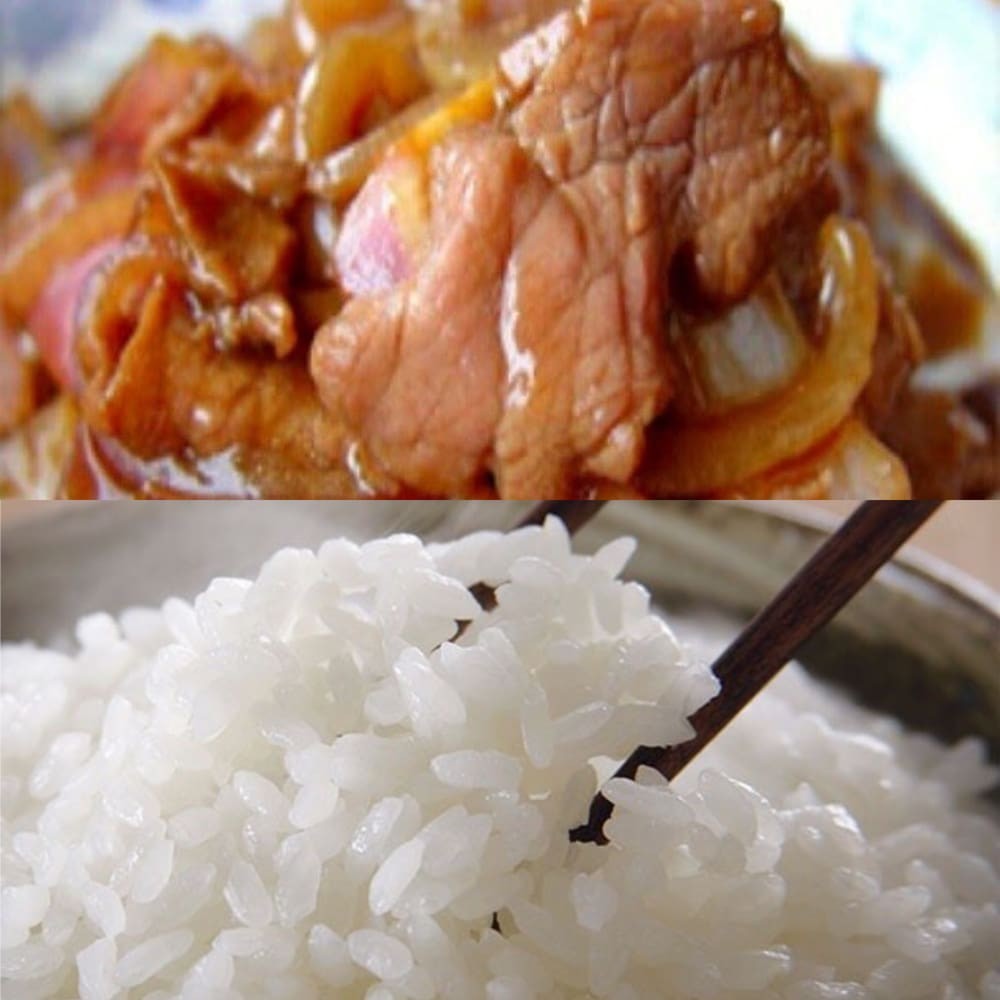 Carne fatiada com cebola torrado ao molho de shoyu, e arroz e salada em uma marmita-750ml
