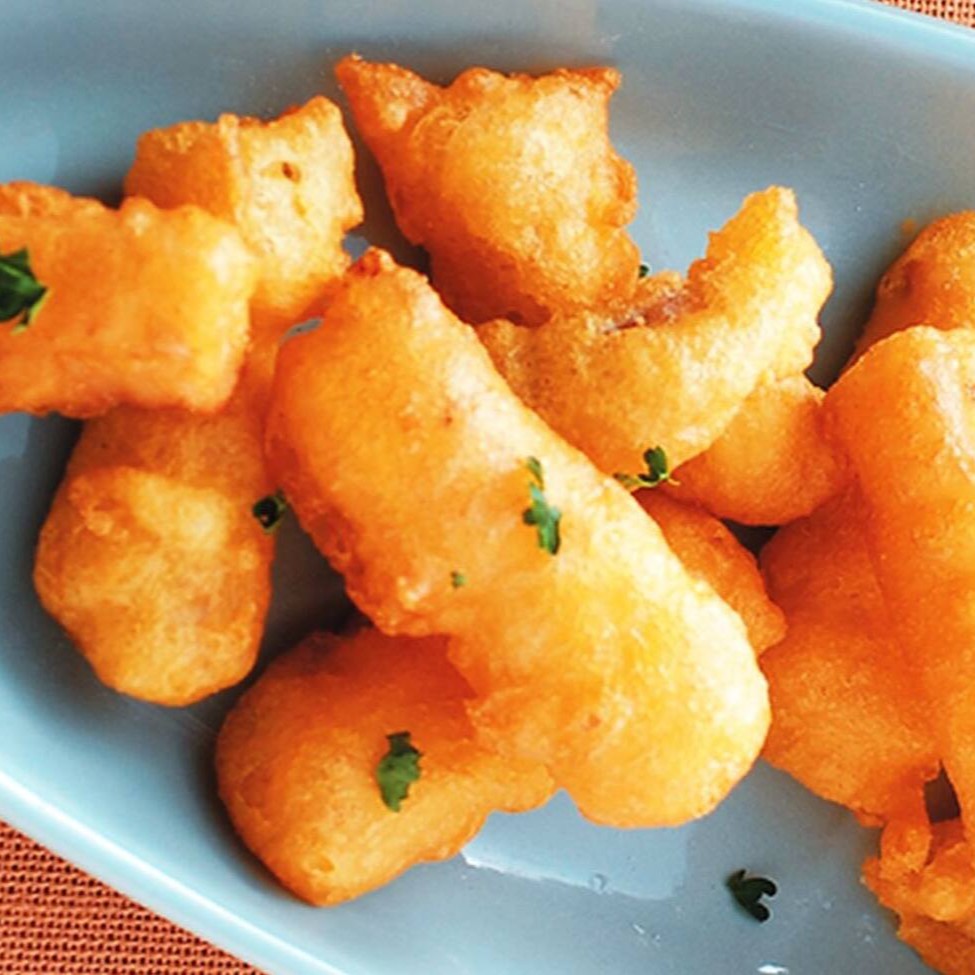Filés de pangasius empanado massa leve,e arroz e salada em uma marmita-750ml